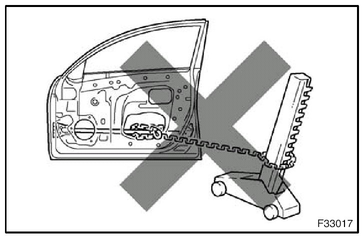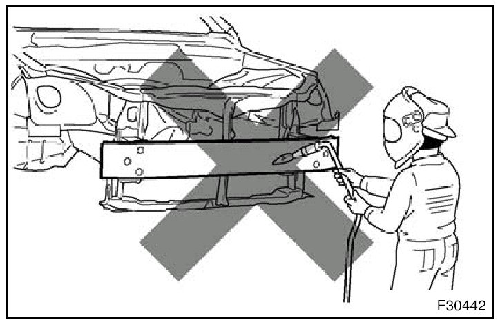 1. Rustproof high strength steel sheets are used for the body frame. Therefore, if these parts are heat repaired using an acetylene torch or equivalent, the crystalline structure changes, causing the strength of the steel sheets to decrease. Also, the zinc coating which is used to protect the body from rust will be damaged. This causes the surface of the steel sheets to become oxidized, which reduces their ability to resist rust.