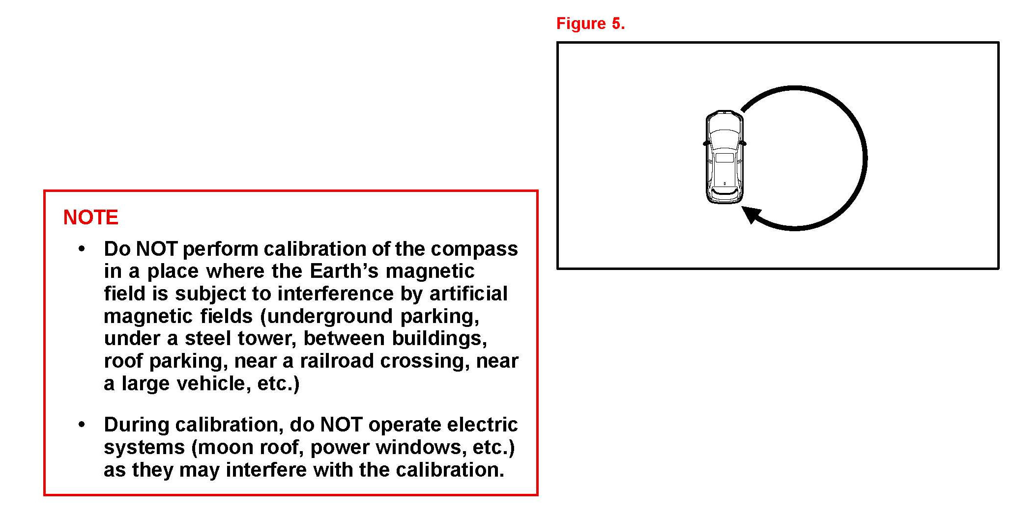 4. Drive the vehicle slowly at 5 mph (8 km/h), or less, in a circle until the direction is displayed. If there is NOT enough space to drive in a circle, drive around the block until the direction is displayed.