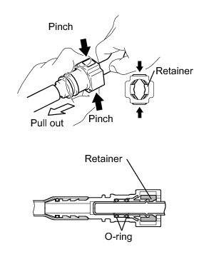 (2) Pinch the tabs of the fuel tube retainer to disengage the 2 claws. Push the retainer down as shown in the illustration.