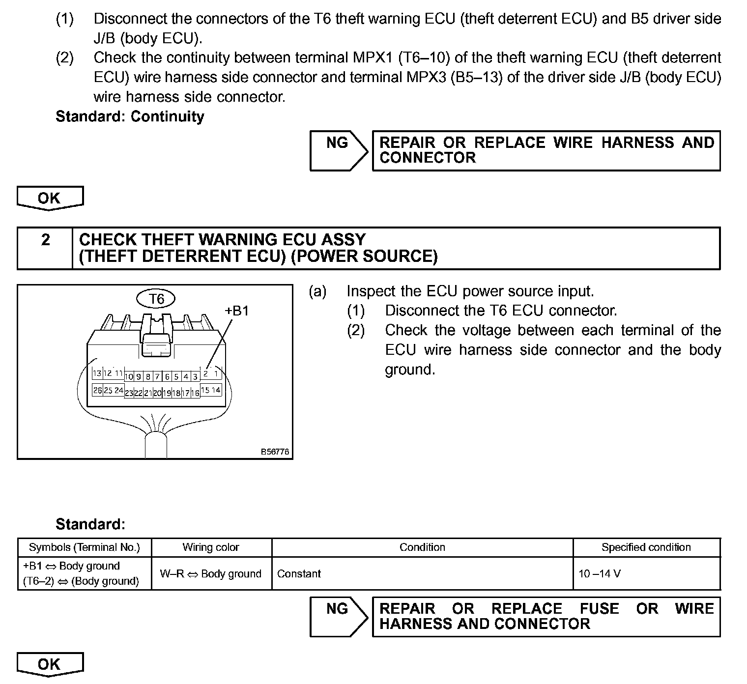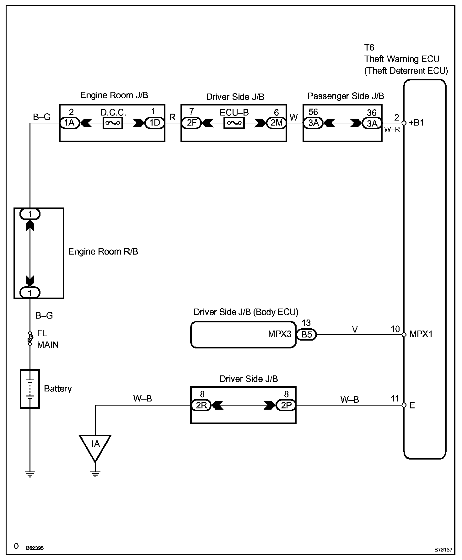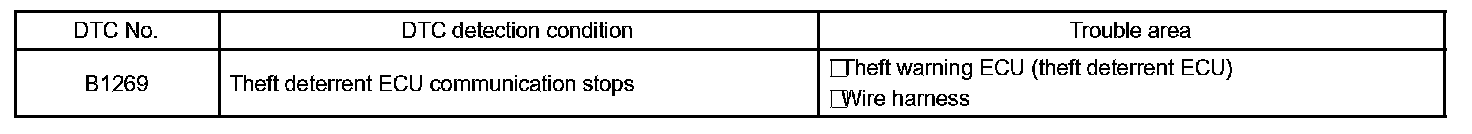 DTC B1269 will be output when the communication between the theft warning ECU (theft deterrent ECU) and body ECU stops for more than 10 seconds.