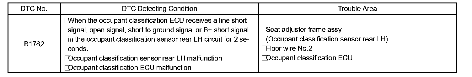DTC B1782 is recorded when a malfunction is detected in the occupant classification sensor rear LH circuit.