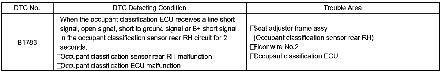 DTC B1783 is recorded when a malfunction is detected in the occupant classification sensor rear RH circuit.