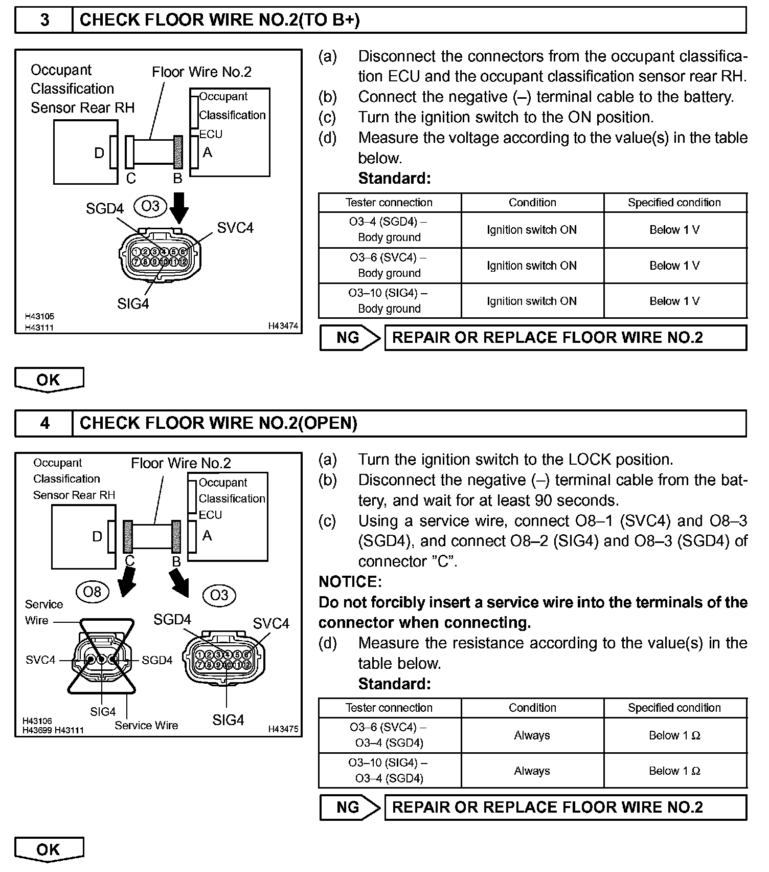 - If troubleshooting (wire harness inspection) is difficult to perform, remove the front RH seat assy installation bolts to see the under surface of seat cushion.