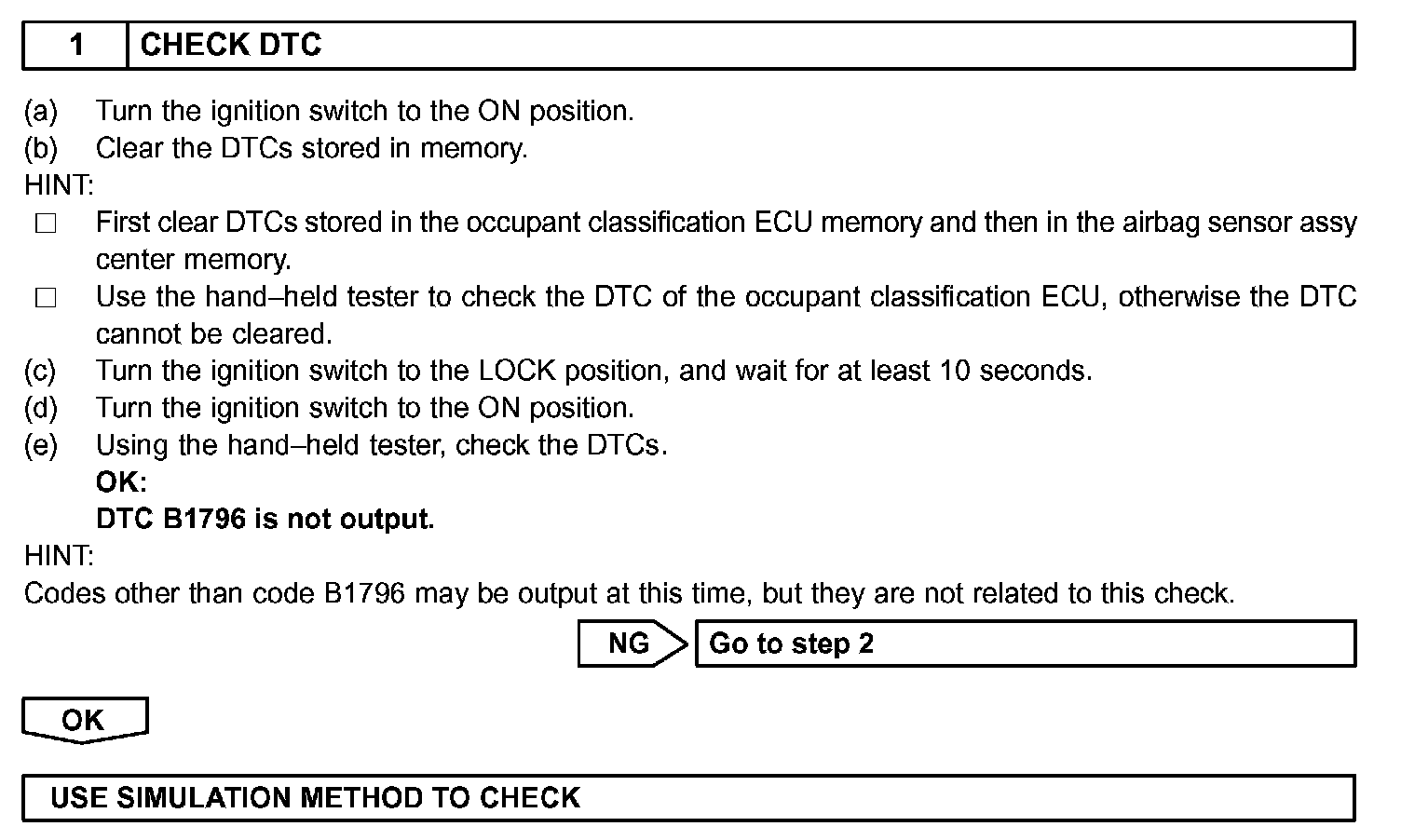 - When DTC B1650/32 is detected as a result of troubleshooting for the supplemental restraint system, perform troubleshooting for the DTC B1796 of the occupant classification ECU.