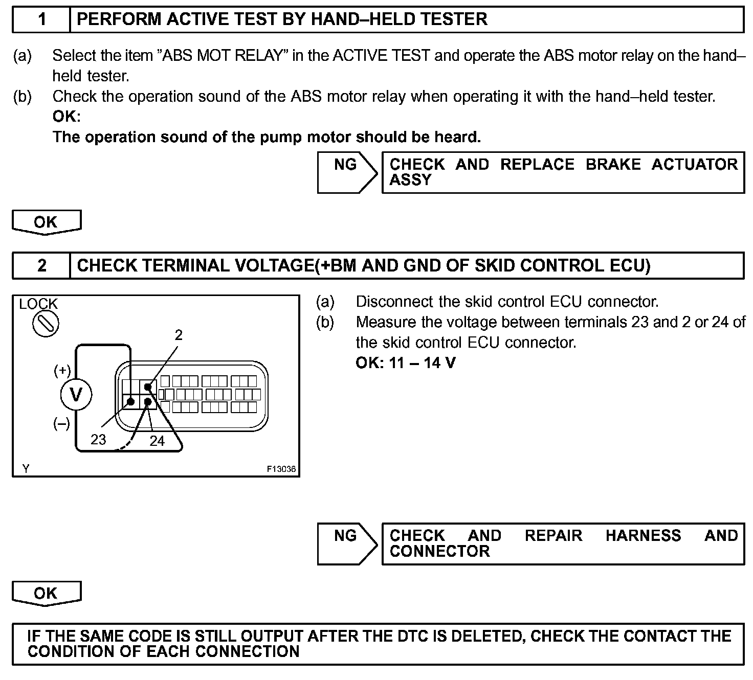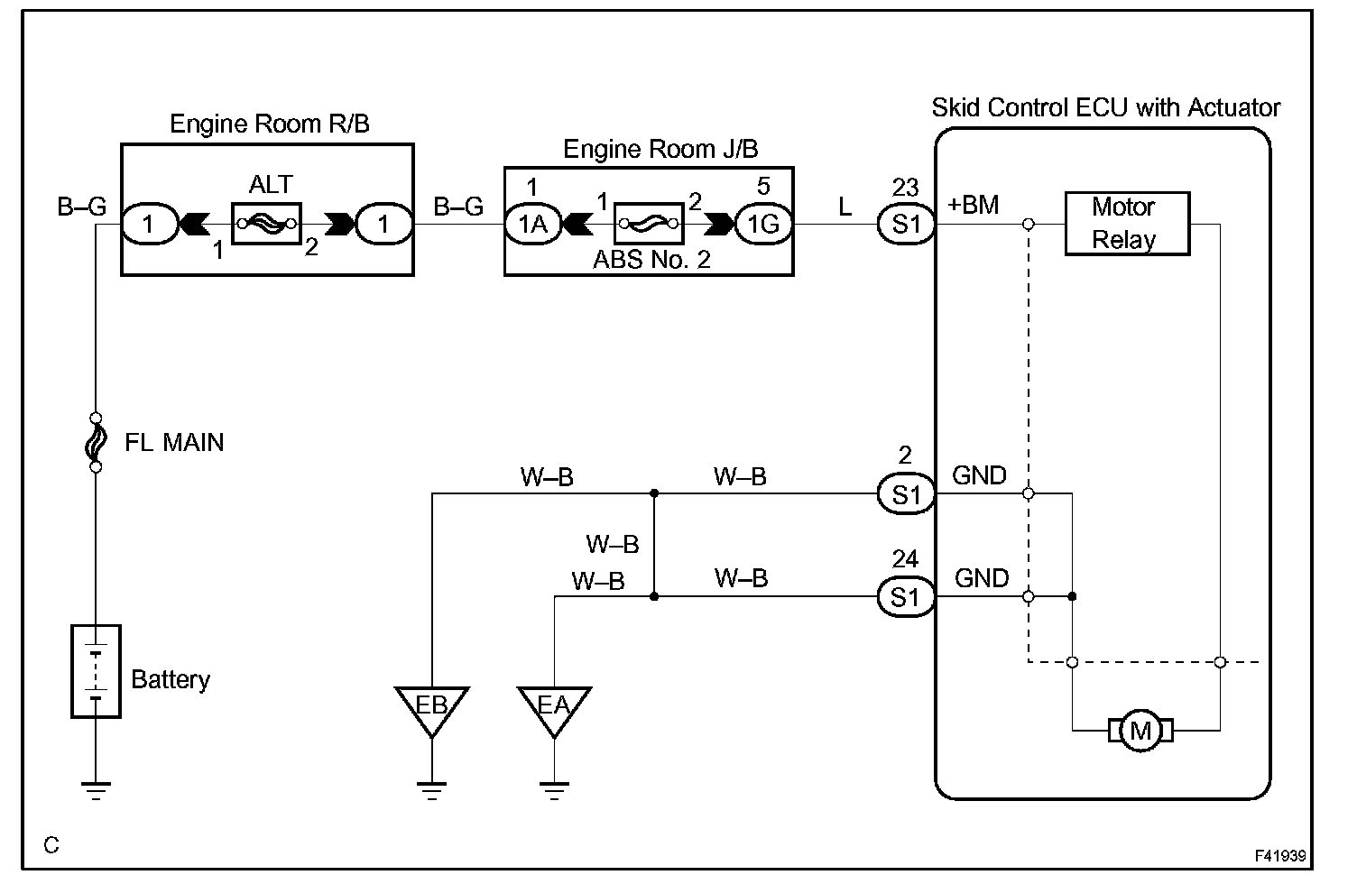 The ABS motor relay supplies power to the ABS pump motor. While the ABS is activated, the ECU switches the ABS motor relay ON and operates the ABS pump motor.