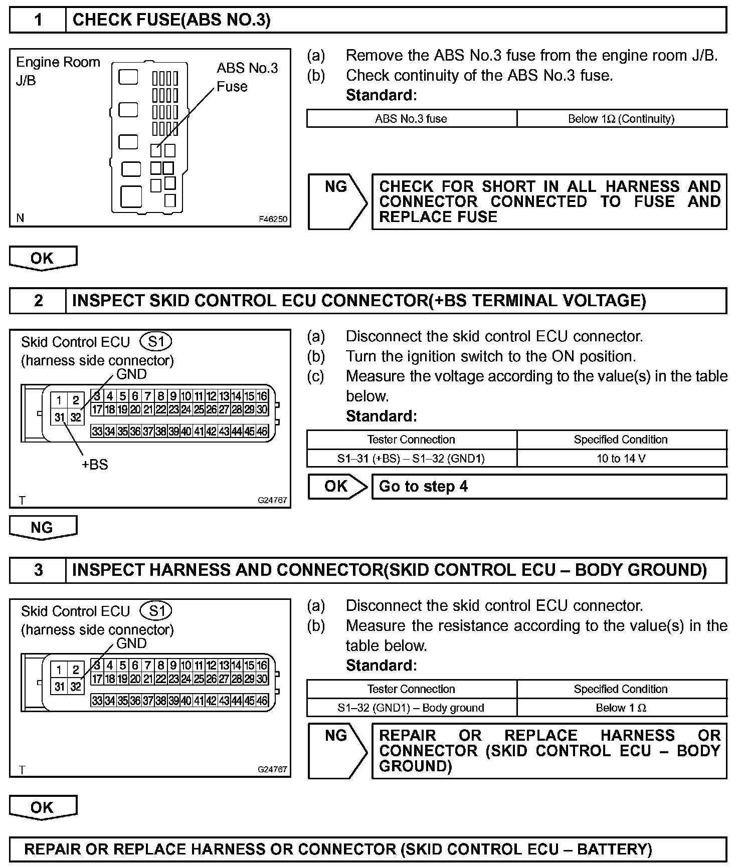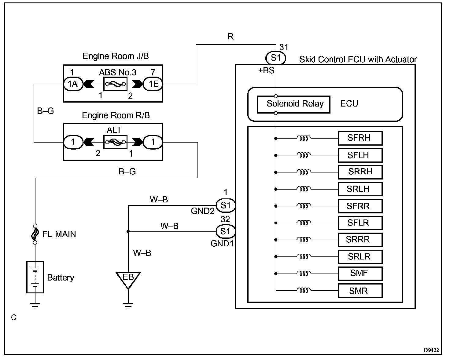 This relay supplies power to each ABS solenoid. If the initial check is OK, after the ignition switch is turned to the ON position, the relay goes on.