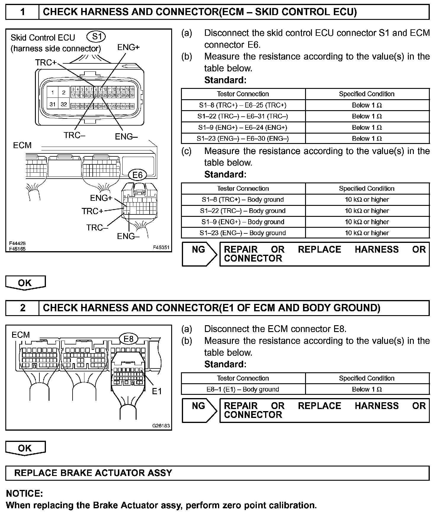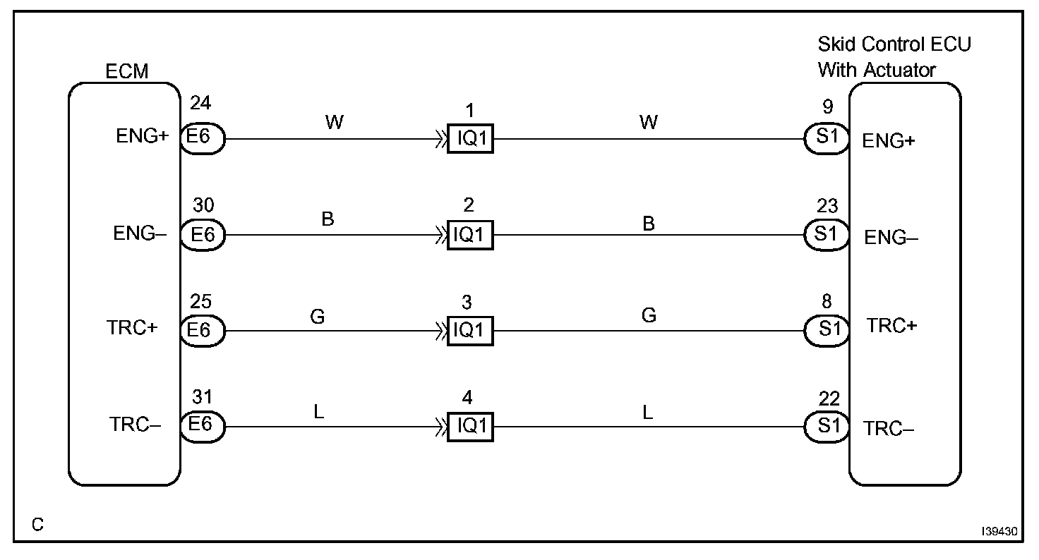 The circuit is used to send TRAC & VSC control information from the skid control ECU to the ECM (TRC+, TRC-), and engine control information from the ECM to the skid control ECU (ENG+, ENG-).