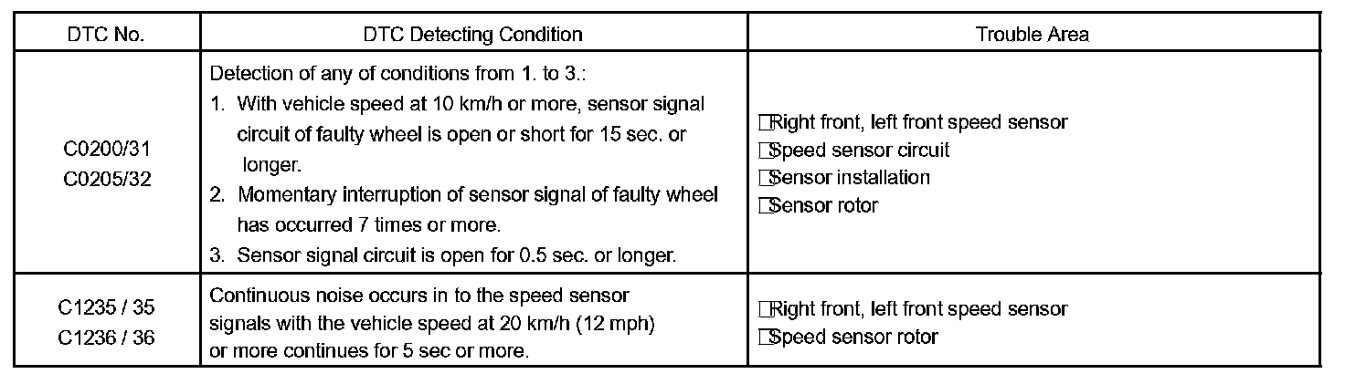 DTC No. C0205/32, C1236/36 is for the left front speed sensor.