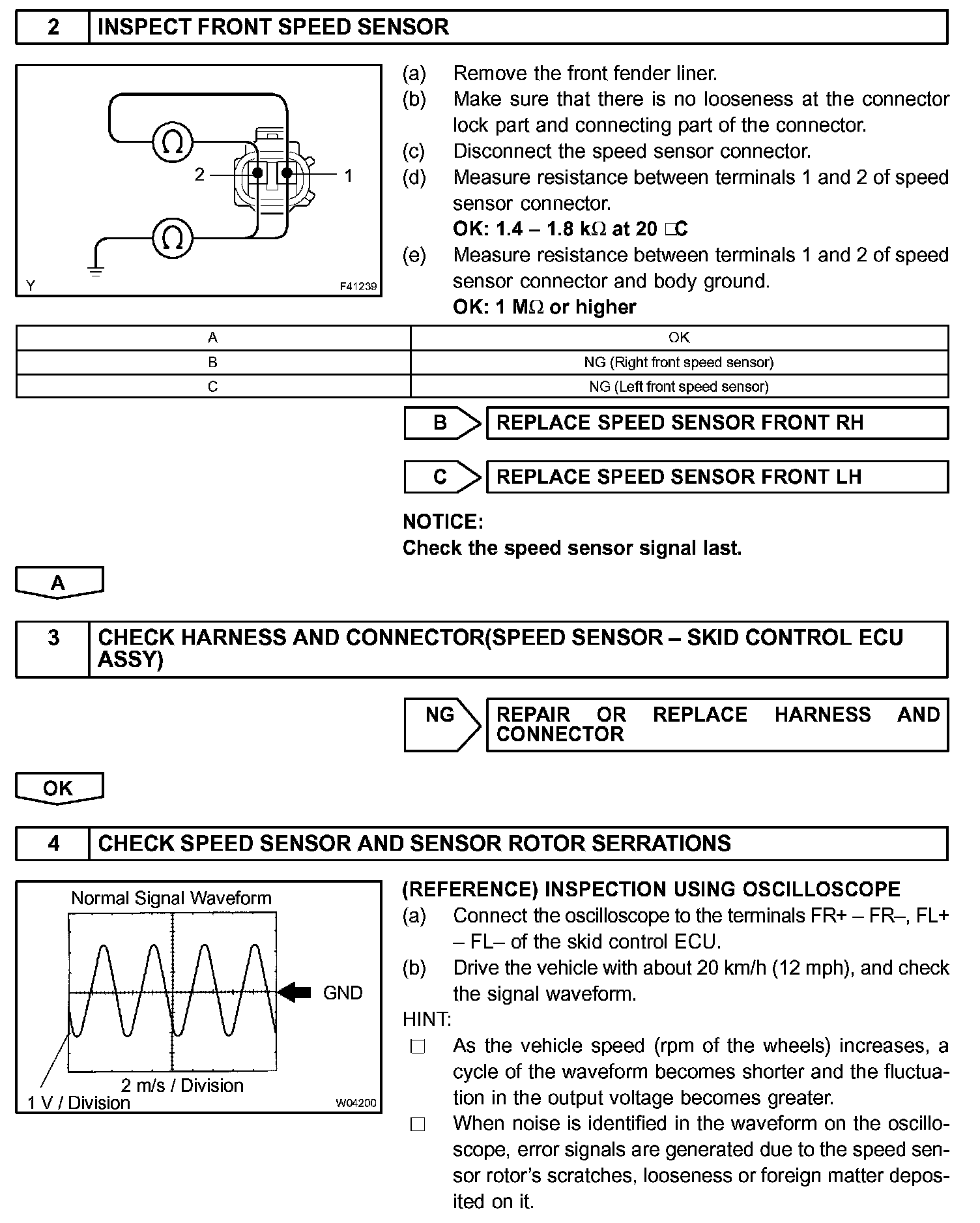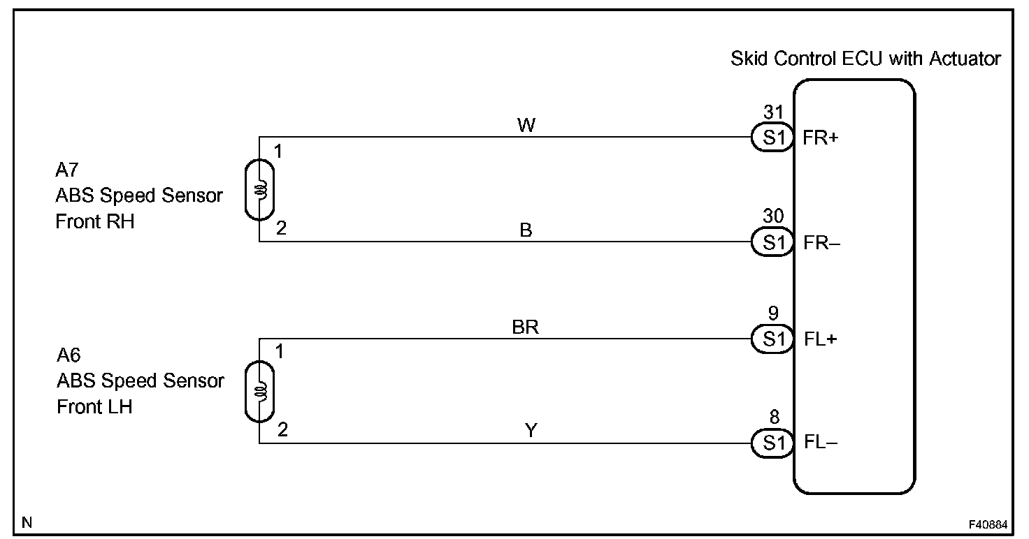 When the rotors rotate, the magnetic field emitted by the permanent magnet in the speed sensor generates an AC voltage. Since the frequency of this AC voltage changes in direct proportion to the speed of the rotor, the frequency is used by the ECU to detect the speed of each wheel.