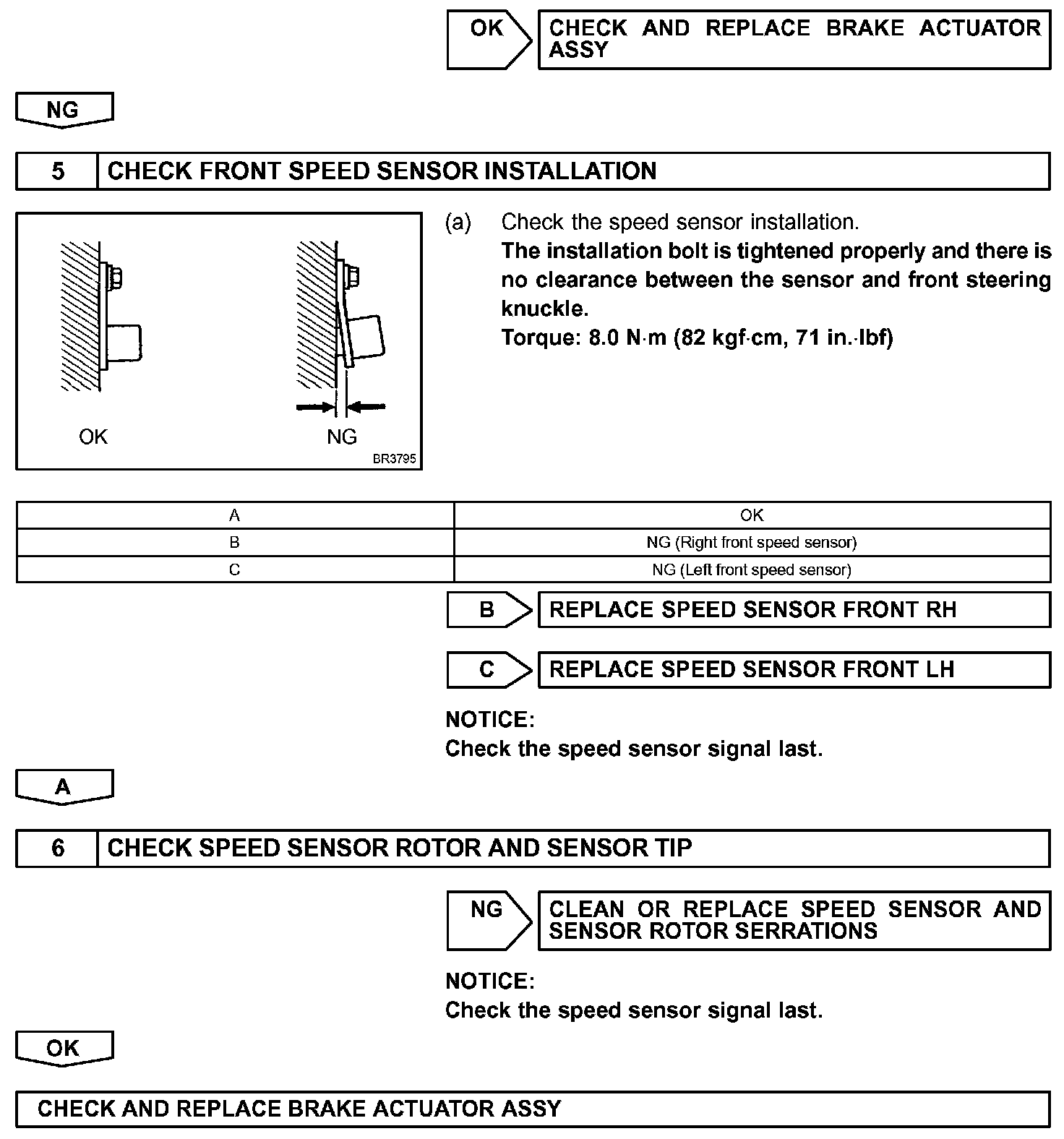 The speed sensor detects wheel speed and sends the appropriate signals to the ECU. These signals are used for control of the ABS control system. The front and rear rotors each have 48 serrations.