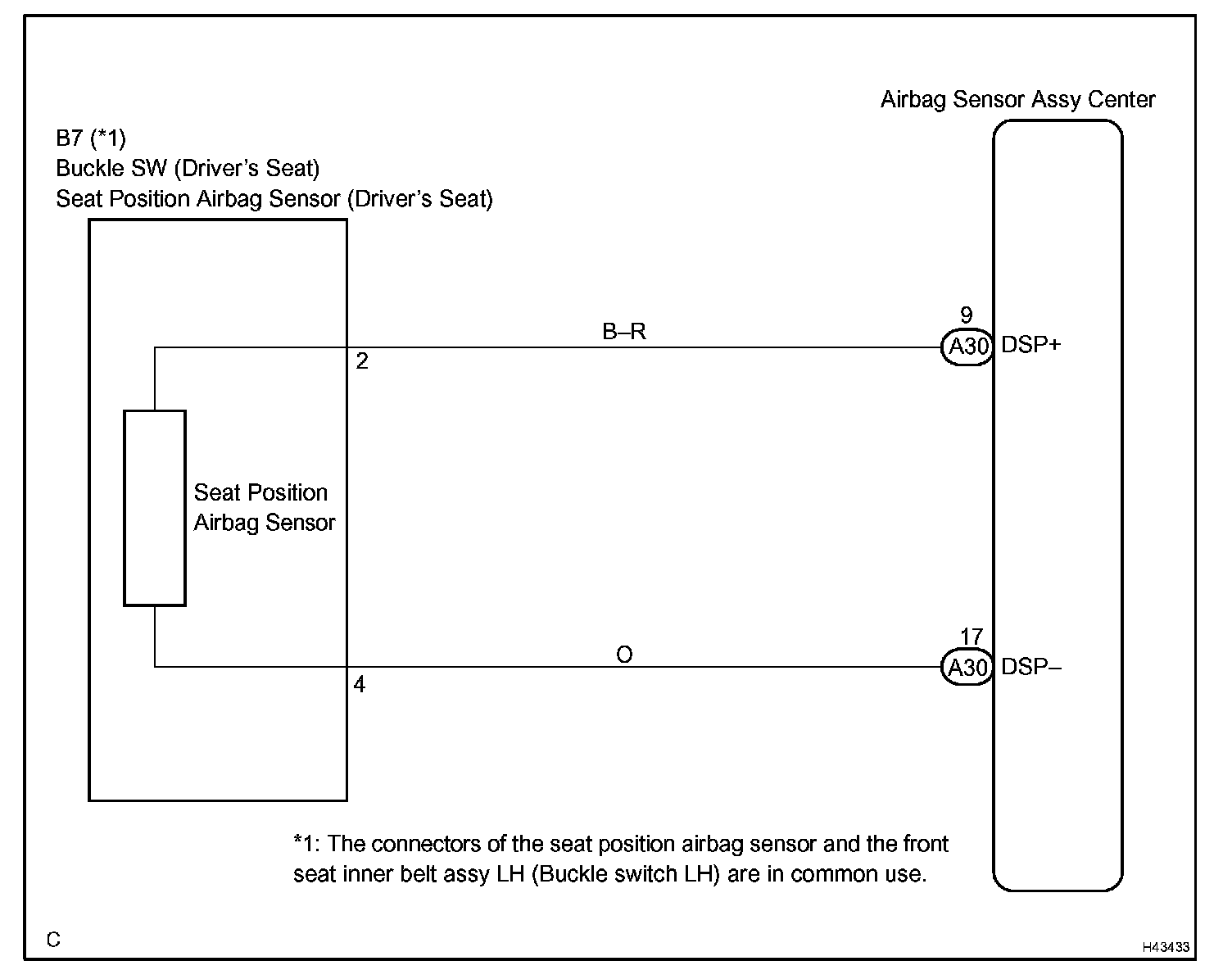 The seat position airbag sensor circuit consists of the airbag sensor assy center and the seat position airbag sensor.
