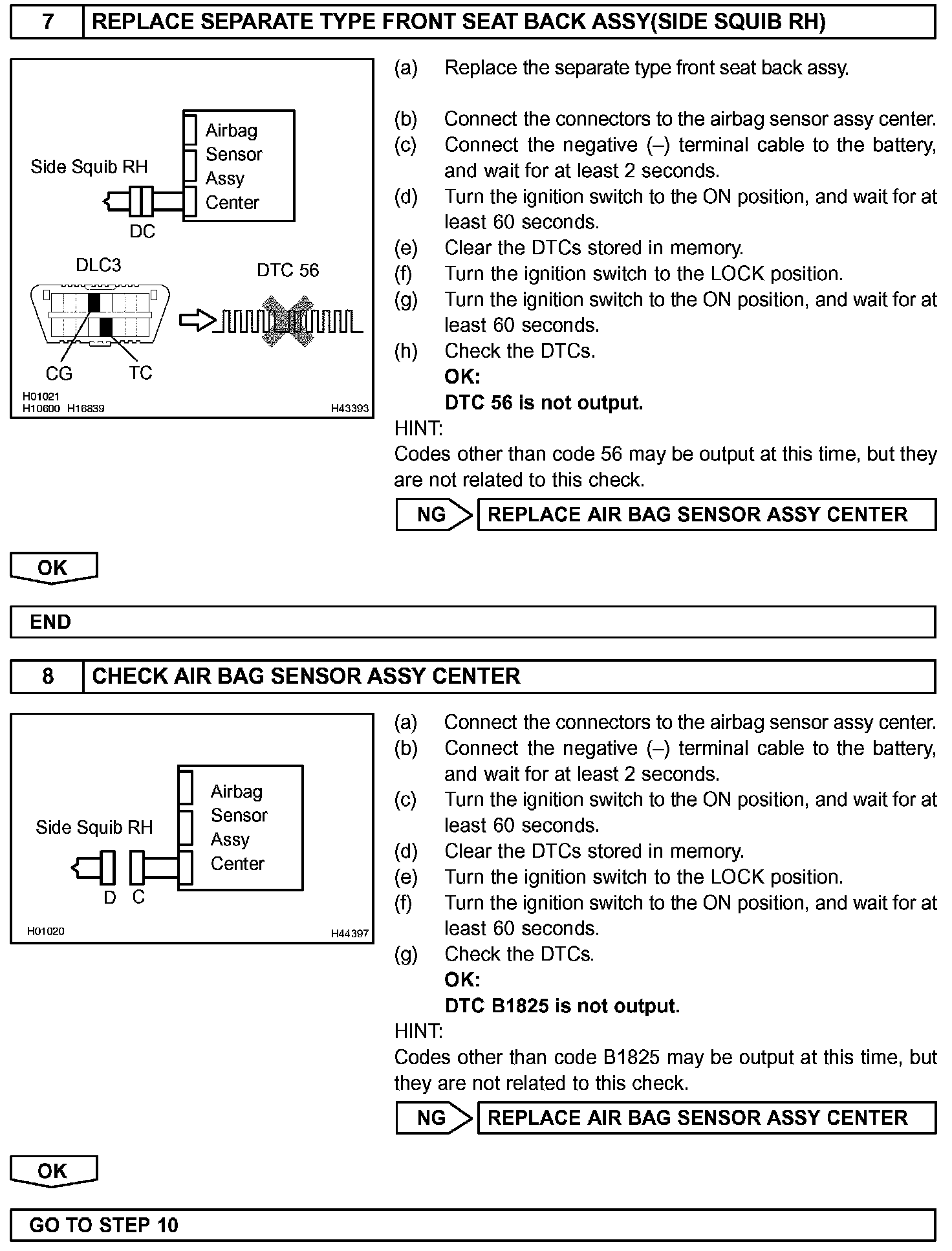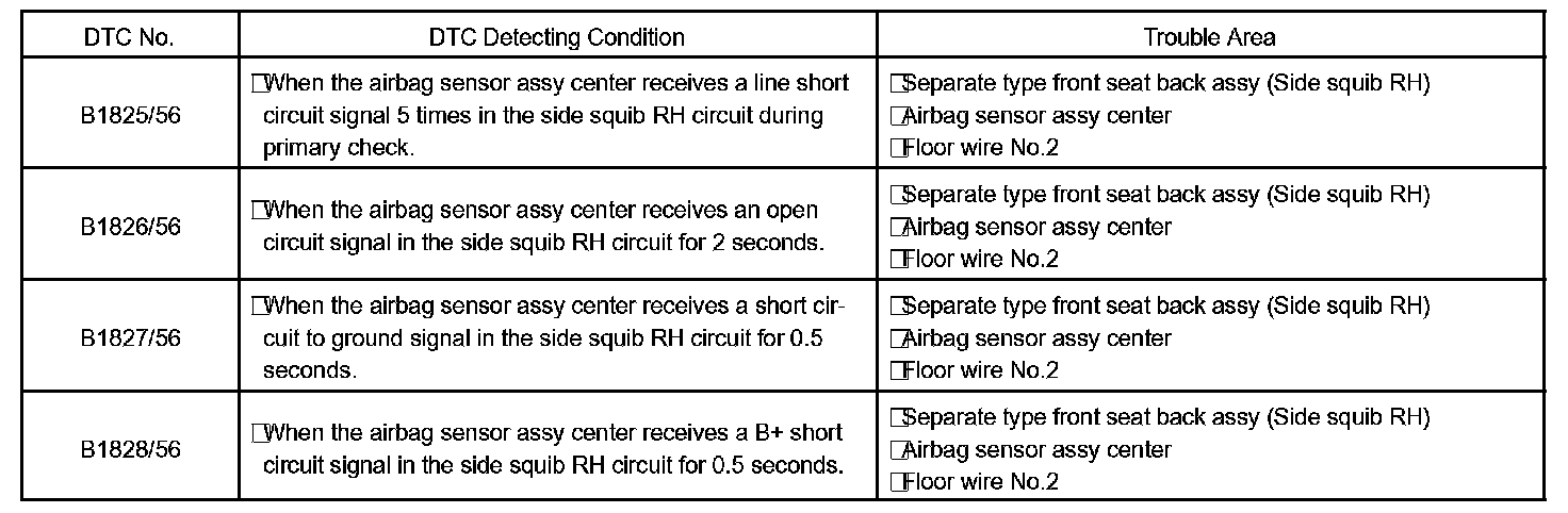 These DTCs are recorded when a malfunction is detected in the side squib RH circuit.
