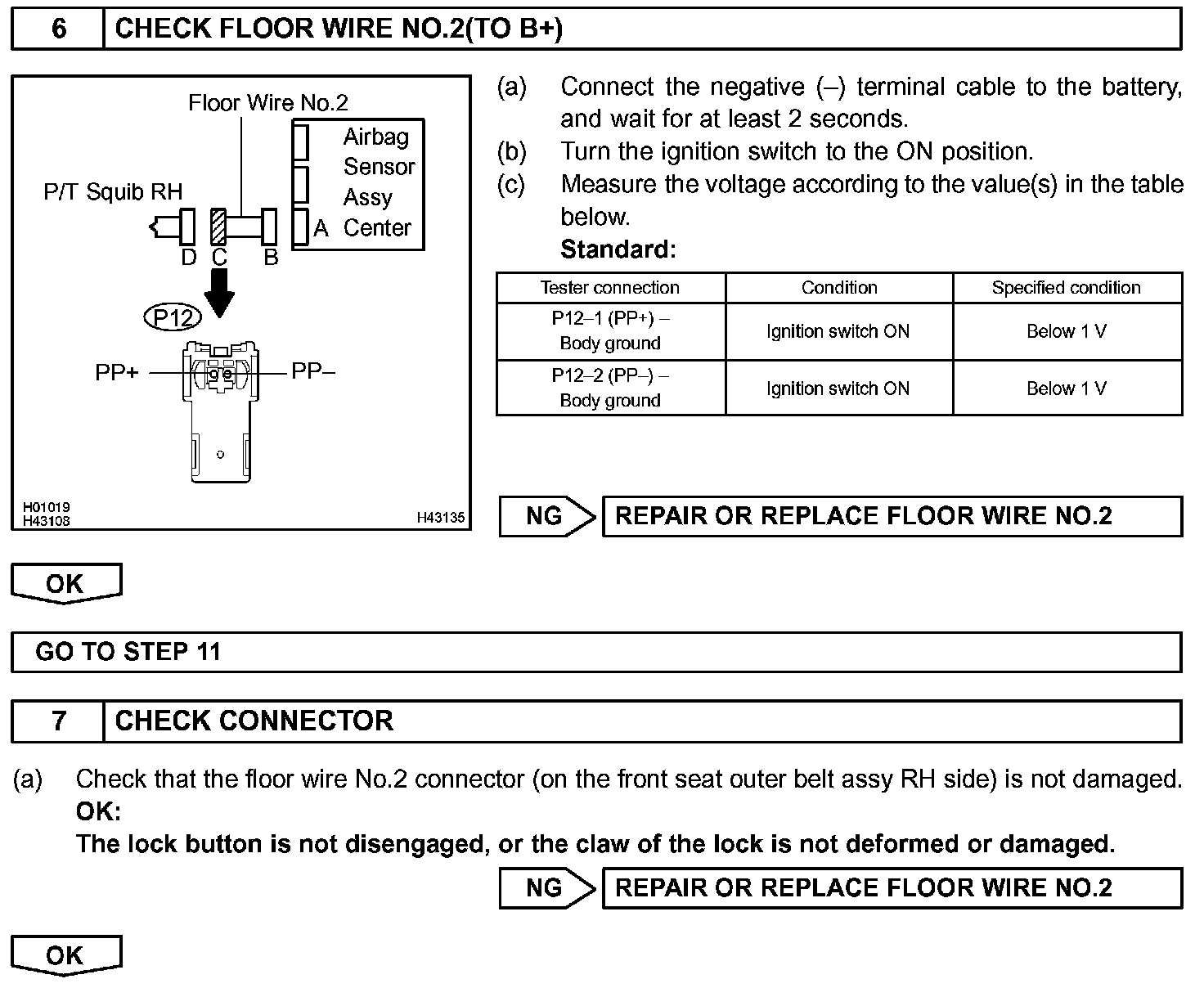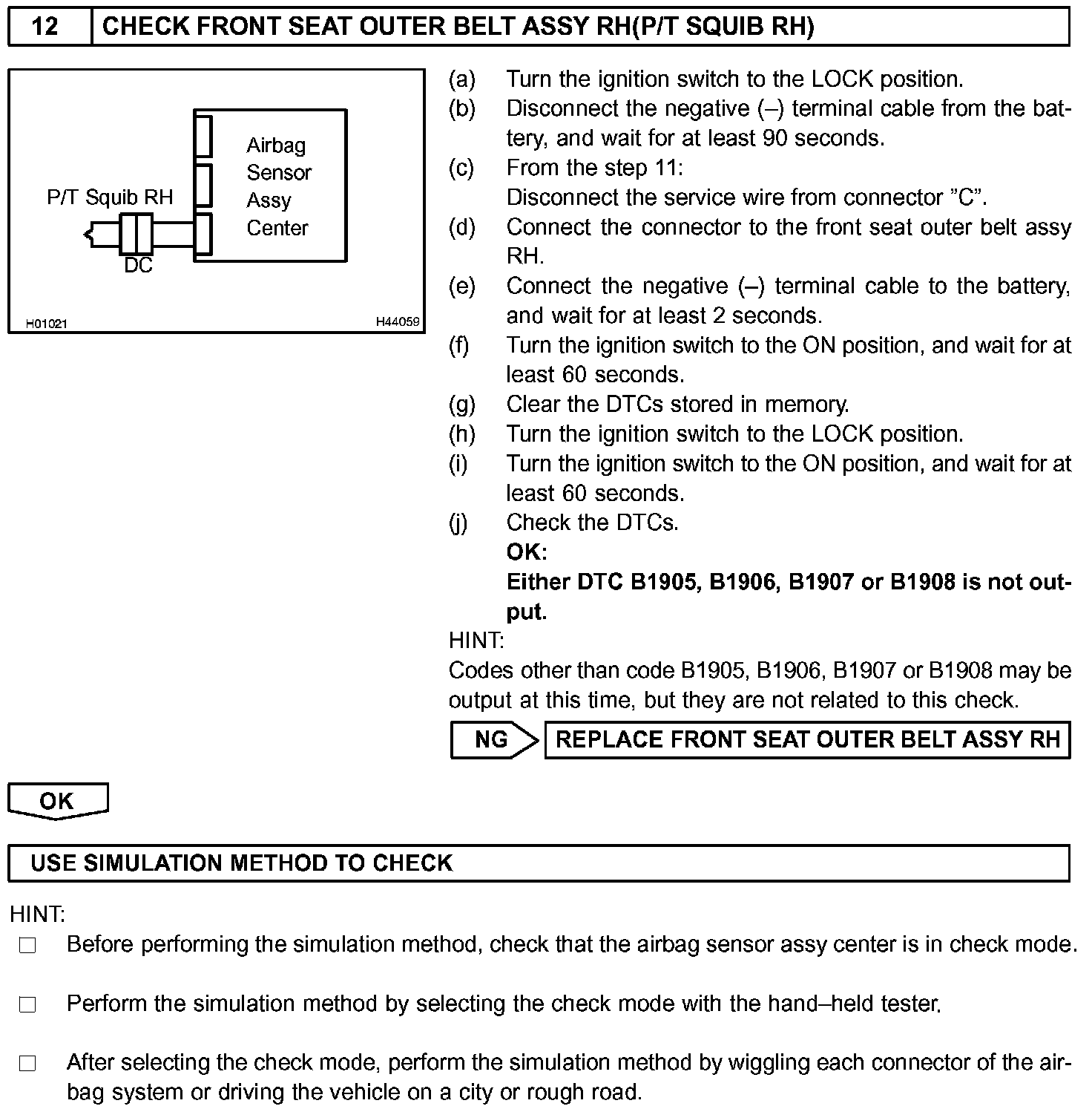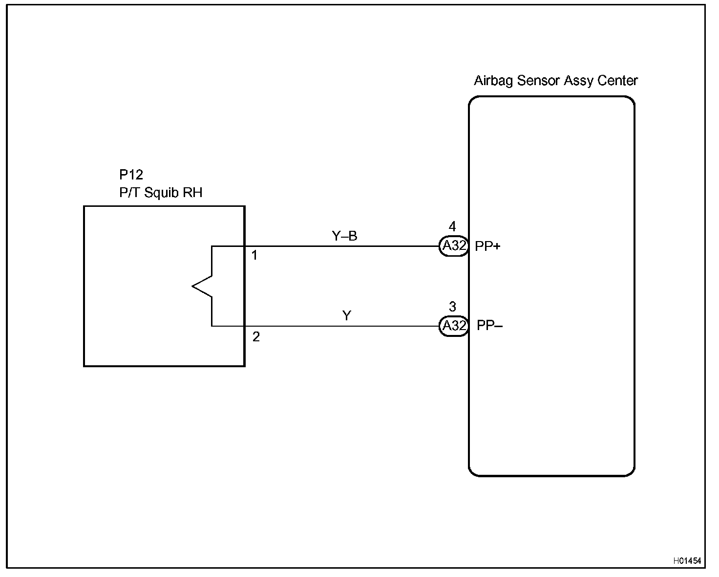 The P/T squib RH circuit consists of the airbag sensor assy center and the front seat outer belt assy RH (seat belt pretensioner RH).