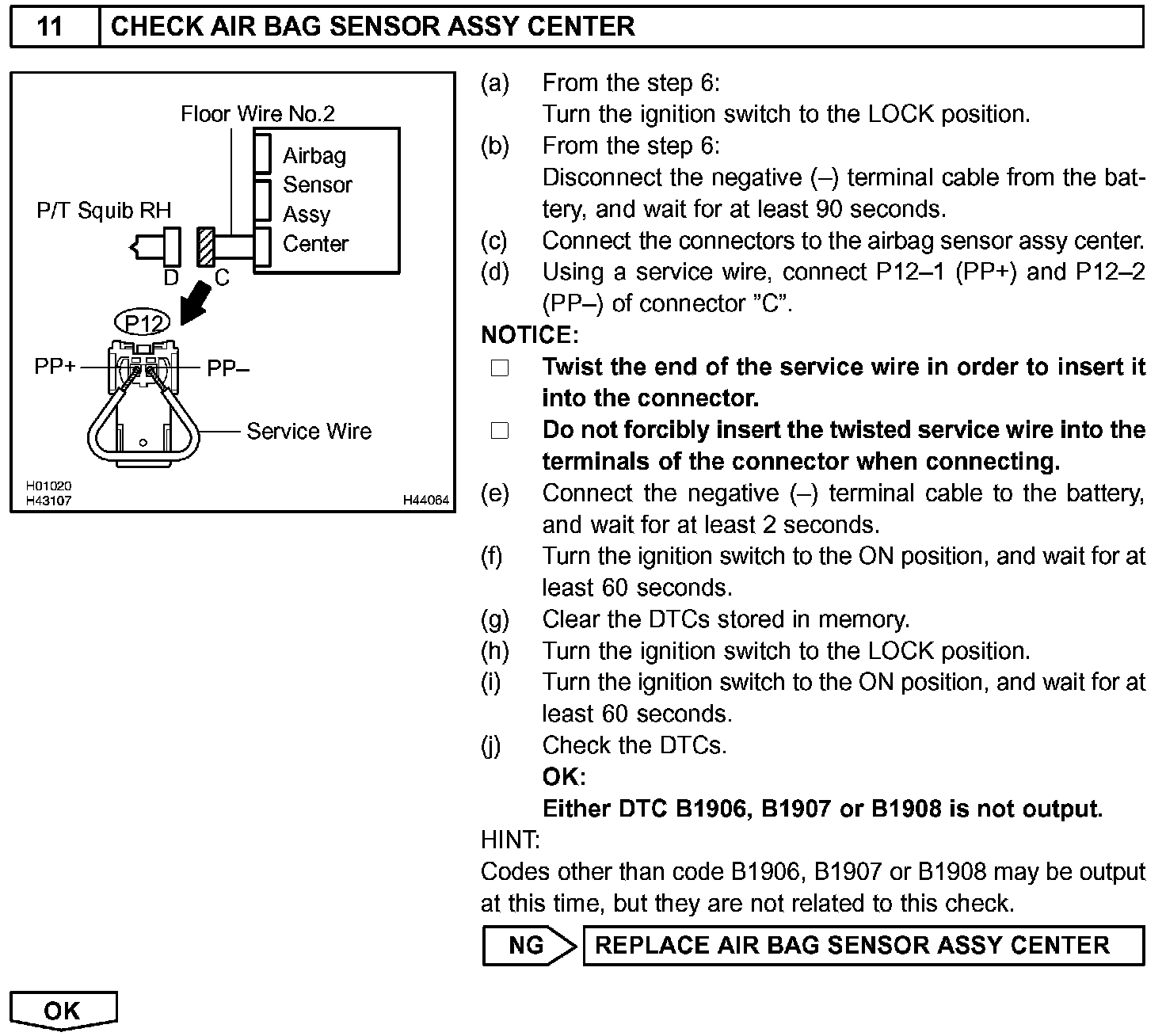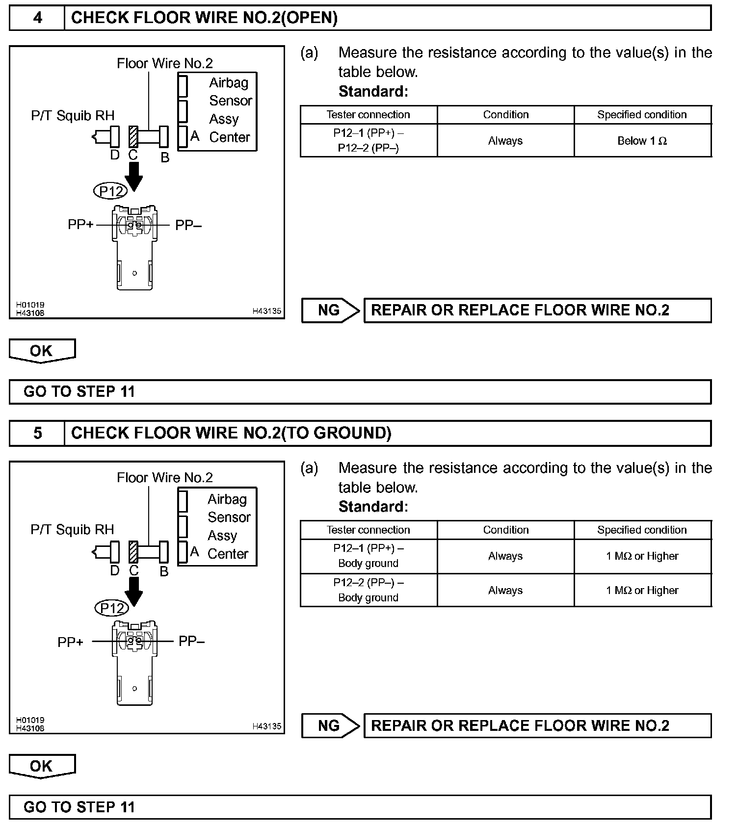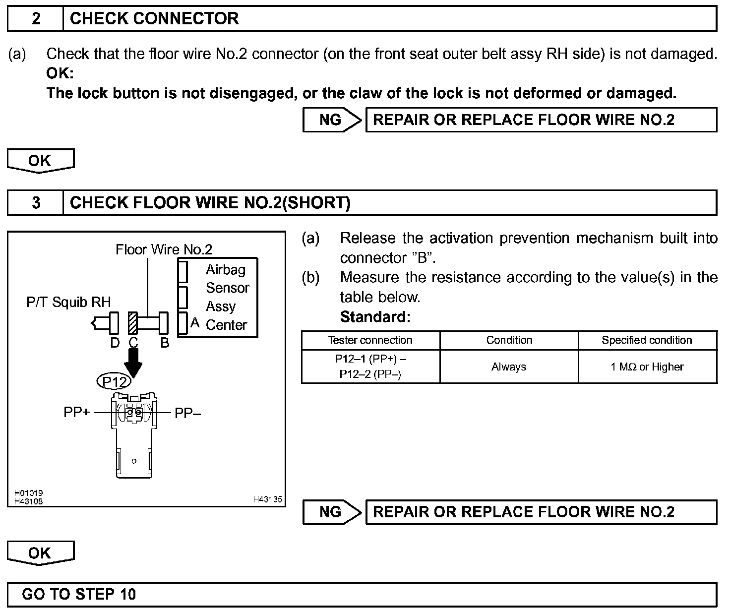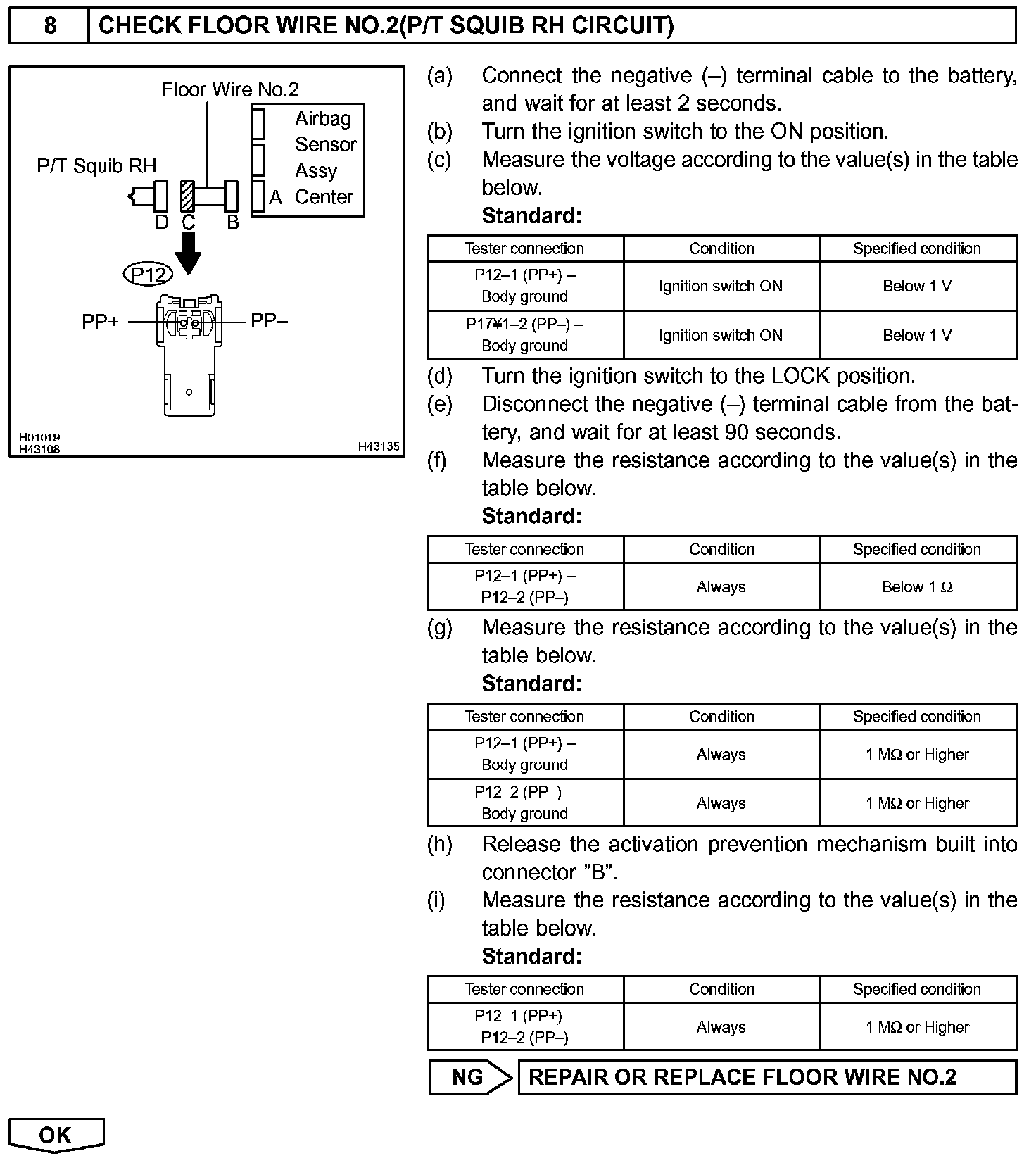 The P/T squib RH circuit consists of the airbag sensor assy center and the front seat outer belt assy RH (seat belt pretensioner RH).