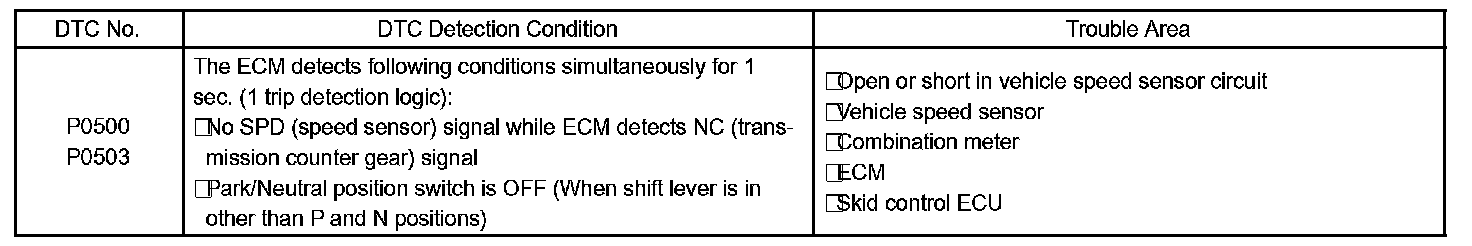 The ECM assumes that the vehicle is being driven when the transmission counter gear indicates more than 300 rpm and over 30 seconds have passed since the park/neutral position switch was turned OFF. If there is no signal from the vehicle speed sensor with these conditions satisfied, the ECM concludes that the vehicle speed sensor is malfunctioning. The ECM will turn on the MIL and a DTC is set.