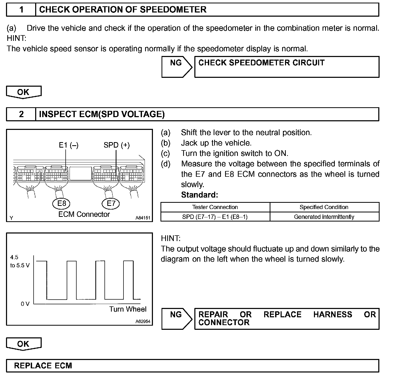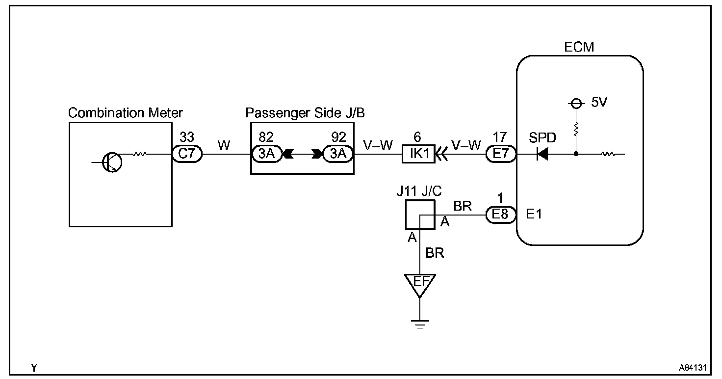 The speed sensor detects the wheel speed and sends appropriate signals to the skid control ECU. The skid control ECU converts these wheel speed signals into a 4-pulse signal and outputs it to the ECM via the combination meter. The ECM determines the vehicle speed based on the frequency of these pulse signals.
