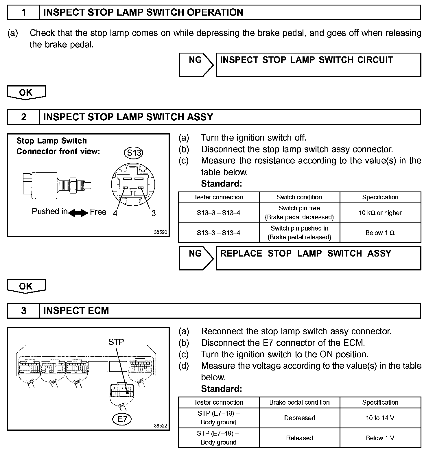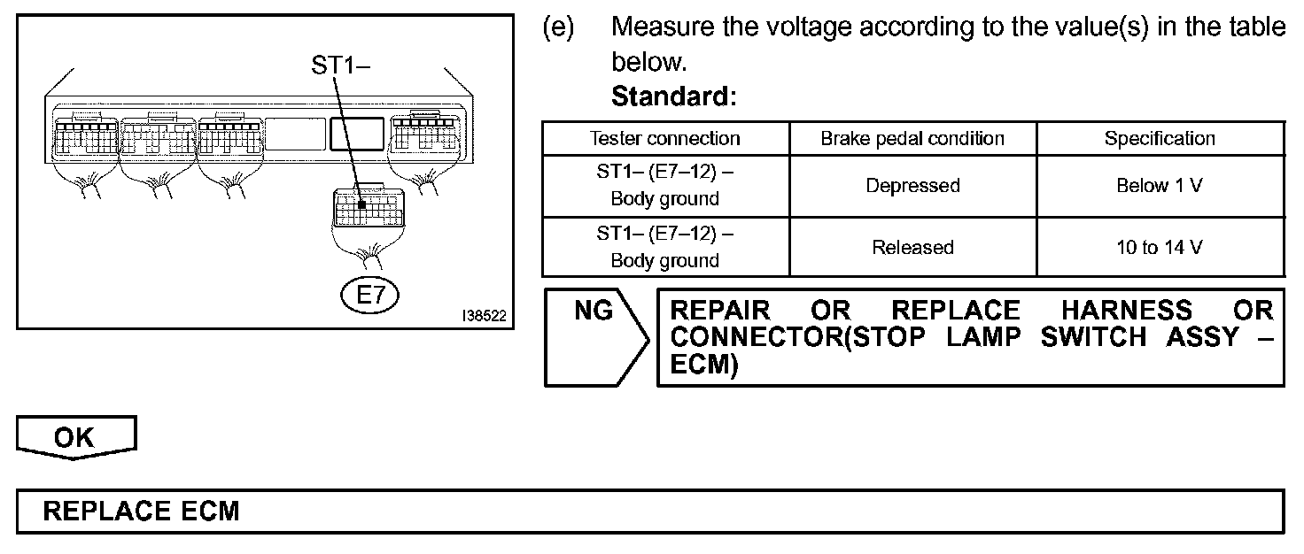The cruise control system cancels cruising when the ECM detects that the brake pedal is depressed while cruise control driving. The stop lamp switch assy sends signals to the ECM according to the brake pedal conditions. When the brake pedal is free, terminal ST1- is positive (+) battery voltage, and terminal STP voltage is below 1 V. While depressing the brake pedal, terminal ST1- is below 1 V, and STP is positive (+) battery voltage. Under braking, the ECM cancels cruise control drive as one of the manual cancel functions. The ECM outputs this trouble code when voltage of terminals ST1- and STP are both below 1 V for 0.5 second or more at the same moment.