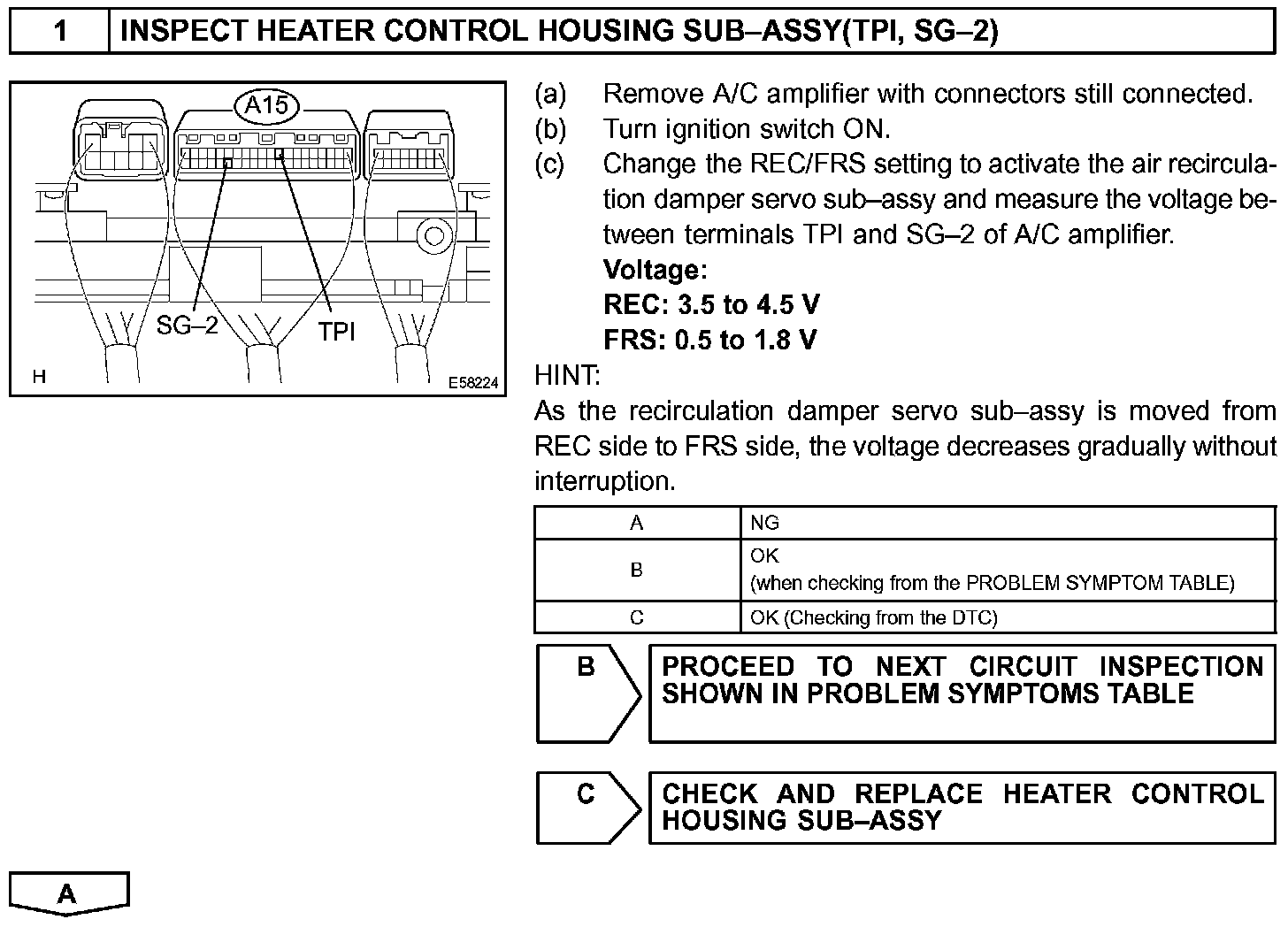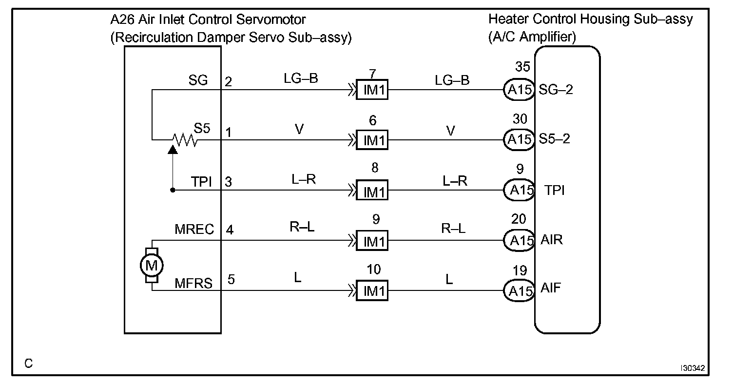 This sensor detects the position of the air inlet damper and sends the appropriate signals to the A/C amplifier. The position sensor is built into the air inlet control servomotor (recirculation damper servo sub-assy).