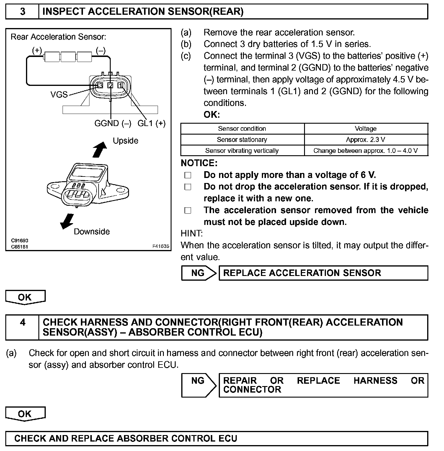 The acceleration sensor (assy) detect the up-and-down acceleration of the vehicle. The acceleration sensor (assy) 3 in total are mounted in the absorber control ECU, at the forward of the glove compartment door at the instrument panel safety pad position and in the rear luggage, and detect the up-and down acceleration of the vehicle, respectively. The acceleration sensor (assy) convert the resistance into electrical signal and output to the absorber control ECU.