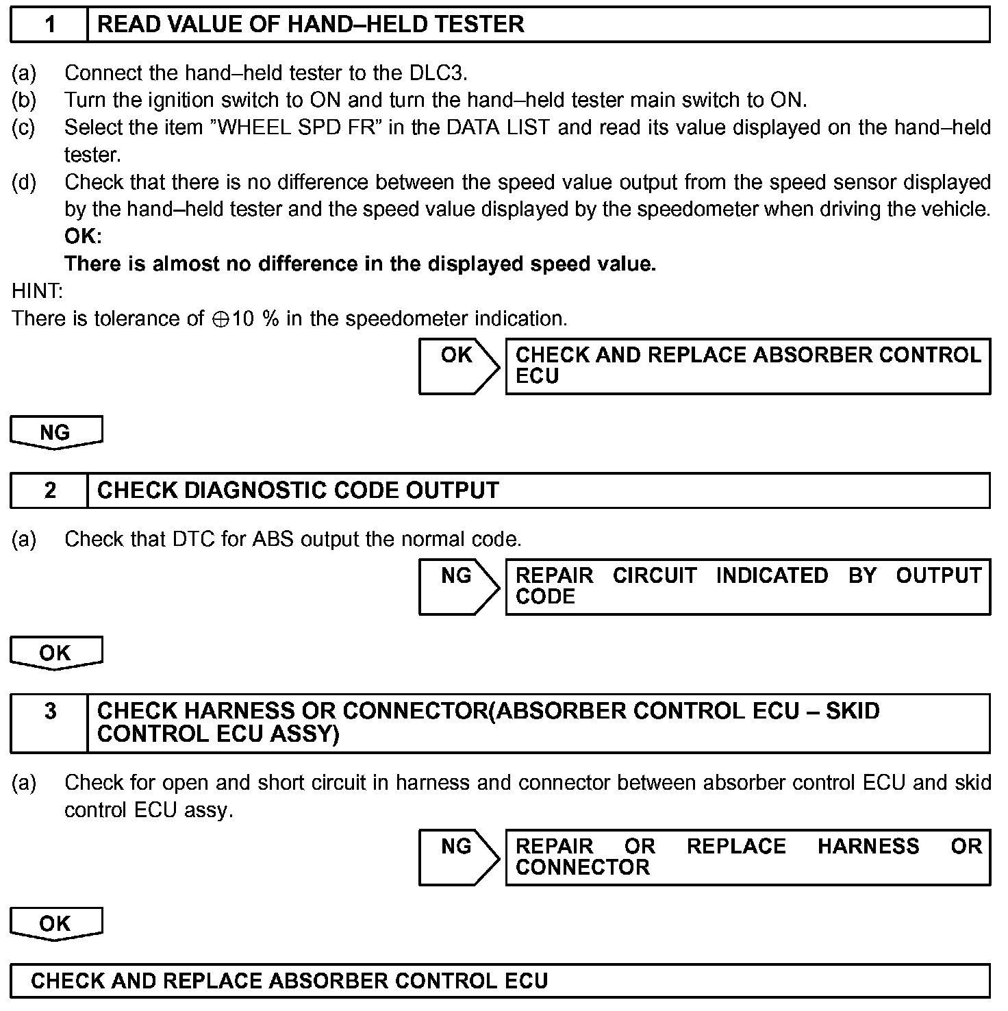 The speed sensor detects the wheel speed and transmits the appropriate vehicle speed signal to the absorber ECU through the skid control ECU assy.