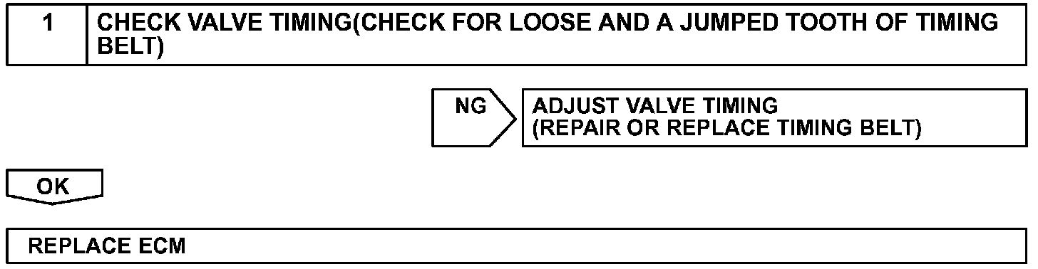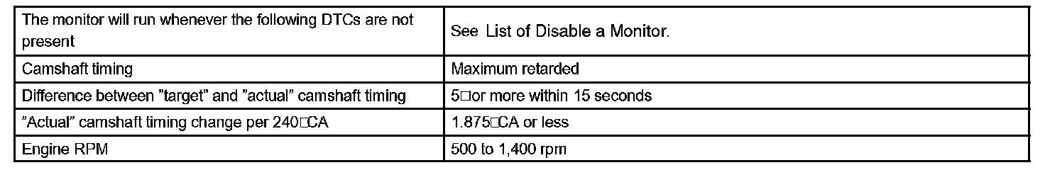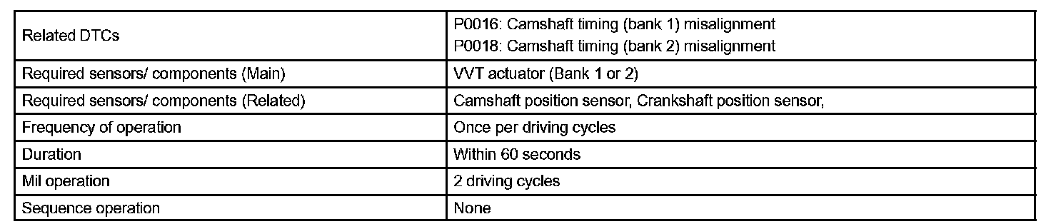 The ECM optimizes the valve timing using the Variable Valve Timing (VVT) system to control the intake valve camshaft. The VVT system includes the ECM, the Oil Control Valve (OCV) and the VVT controller. The ECM sends a target "duty-cycle" control signal to the OCV. This control signal, applied to the OCV, regulates the oil pressure supplied to the VVT controller. The VVT controller can advance or retard the intake valve camshaft. The ECM calibrates the valve timing of the VVT system by setting the camshaft to the maximum retard angle when the engine speed is idling. The ECM closes the OCV to retard the cam. The ECM stores this valve as "VVT learned value" (When the difference between the target valve timing and the actual valve timing is 5 degrees or less, the ECM stores this in its memory).