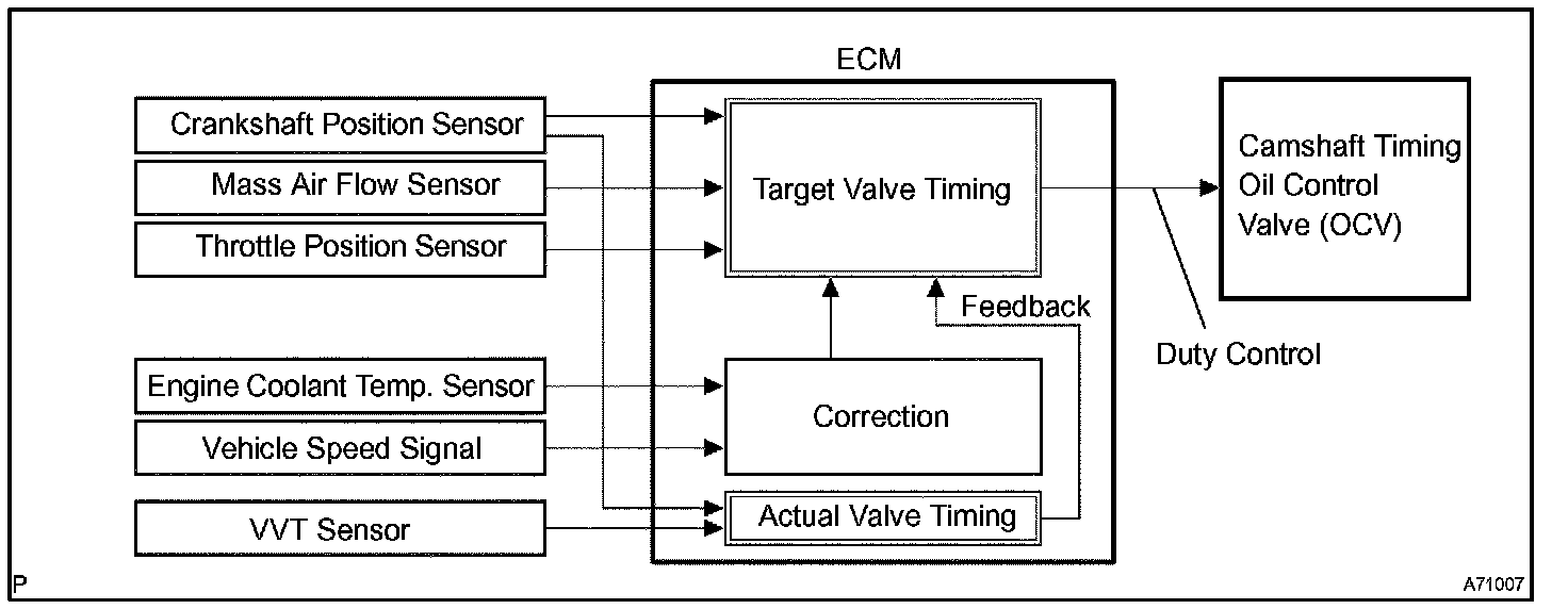 The ECM controls the OCV based on the signals output from several sensors. The VVT controller regulates the intake camshaft angle using oil pressure through the OCV. As result, the relative position between the camshaft and the crankshaft is optimized, and the engine torque improves, fuel economy improves, and exhaust emissions decrease. The ECM detects the actual valve timing using signals from the camshaft position sensor and the crankshaft position sensor. The ECM performs feedback control and verifies target valve timing.
