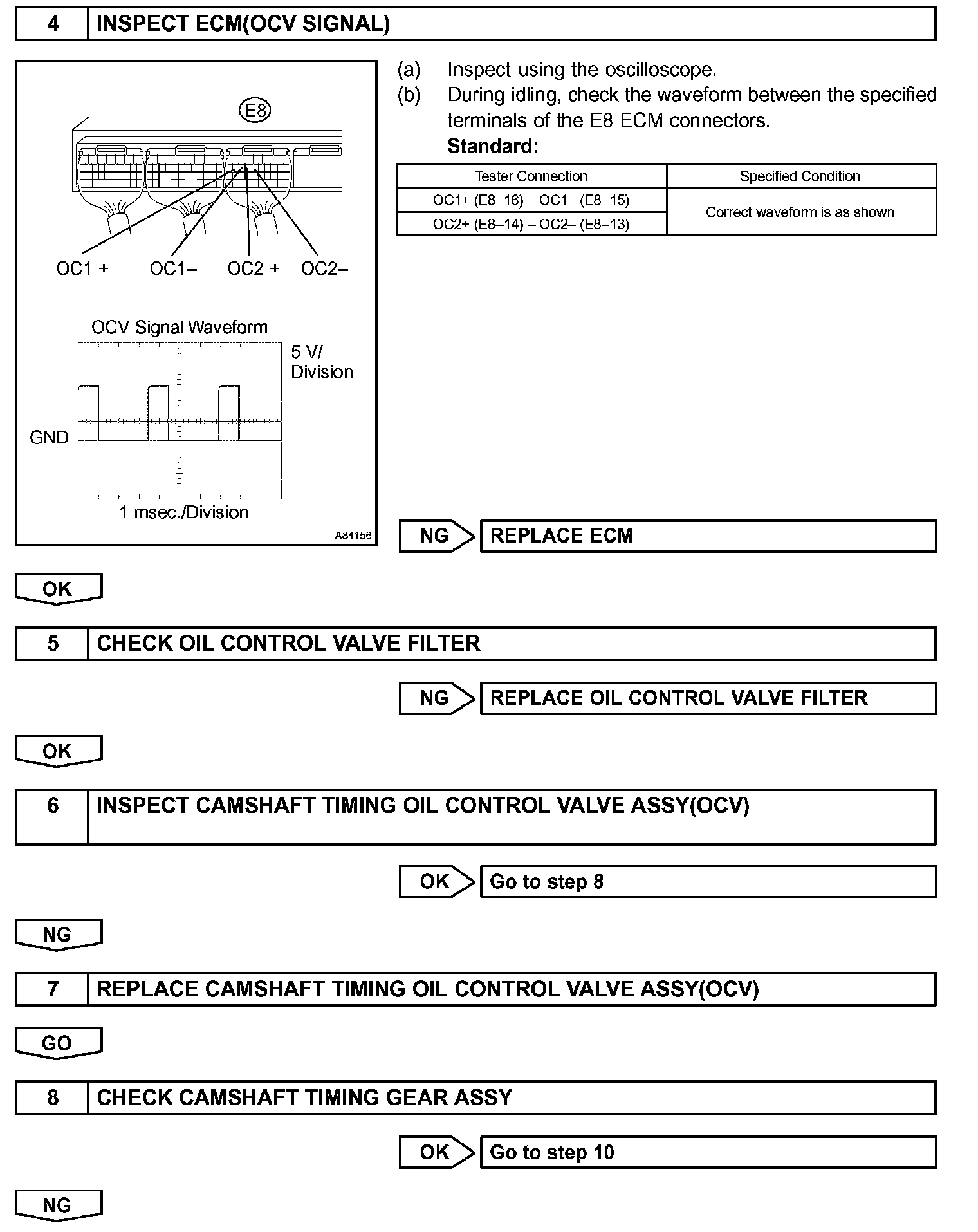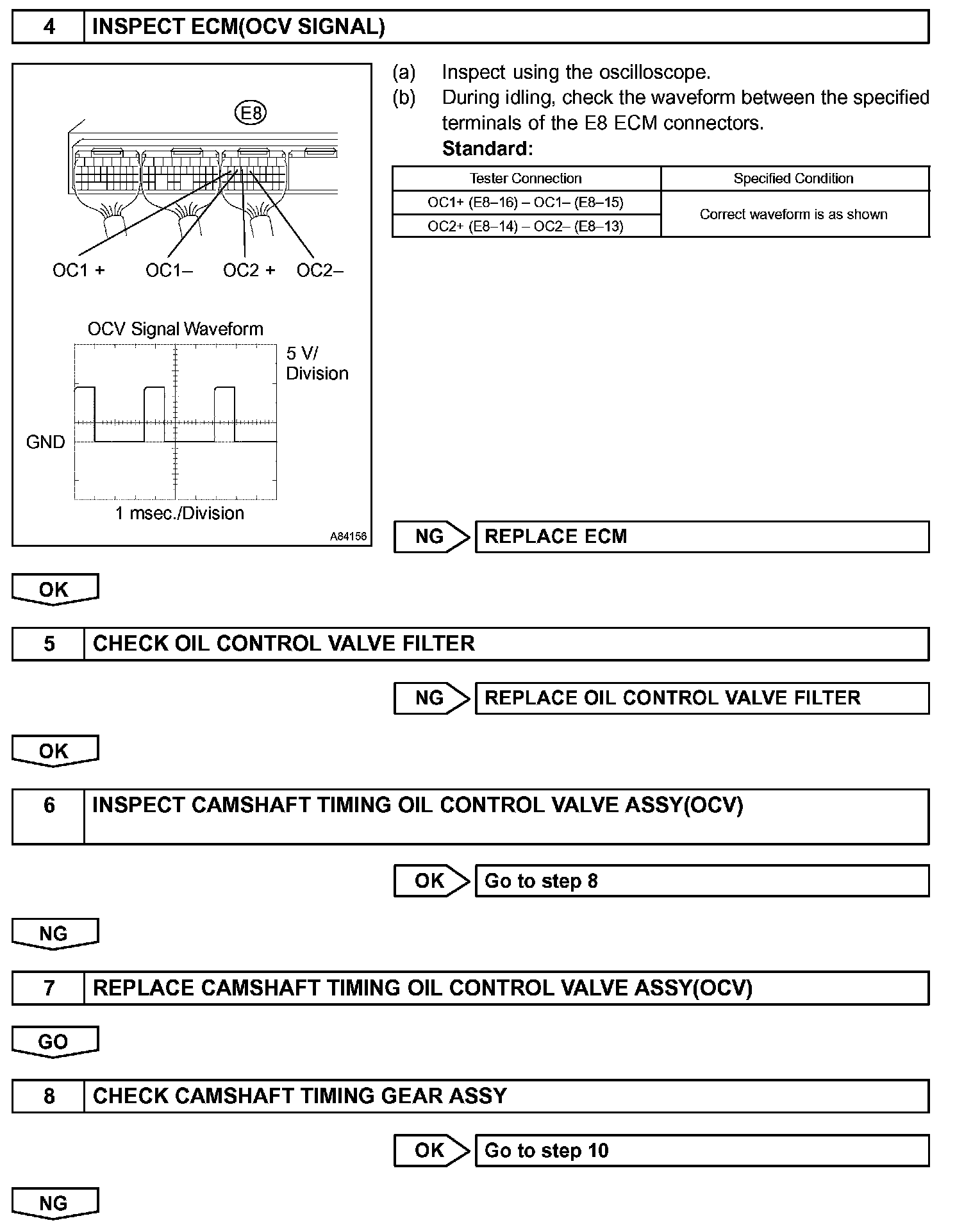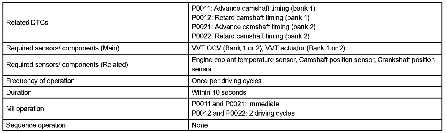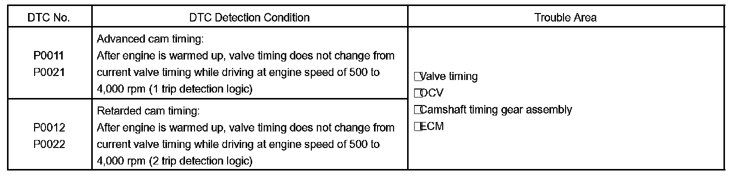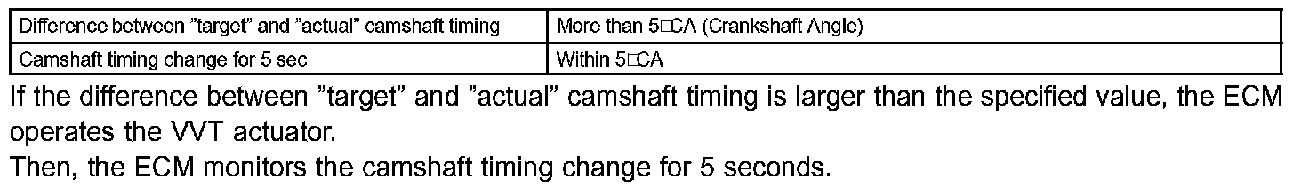 1. the difference between the target and actual valve timing is more than 5 degrees of the camshaft angle (CA) and this condition continues for more than 4.5 seconds; or