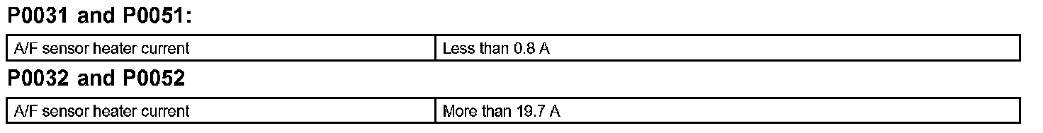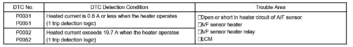 DTC P0031 OXYGEN (A/F) SENSOR HEATER CONTROL CIRCUIT LOW (BANK 1 SENSOR 1)HINT: Although each DTC title says "oxygen sensor", these DTCs are related to the air-fuel ratio sensor (A/F sensor).