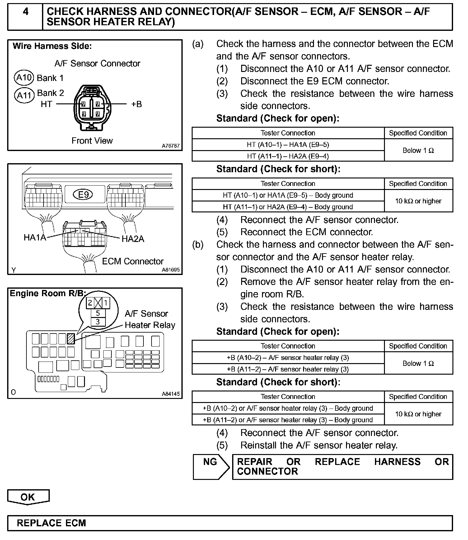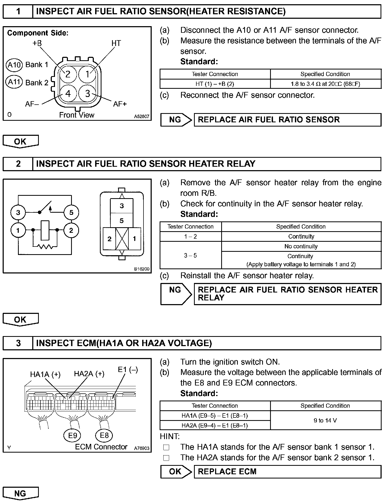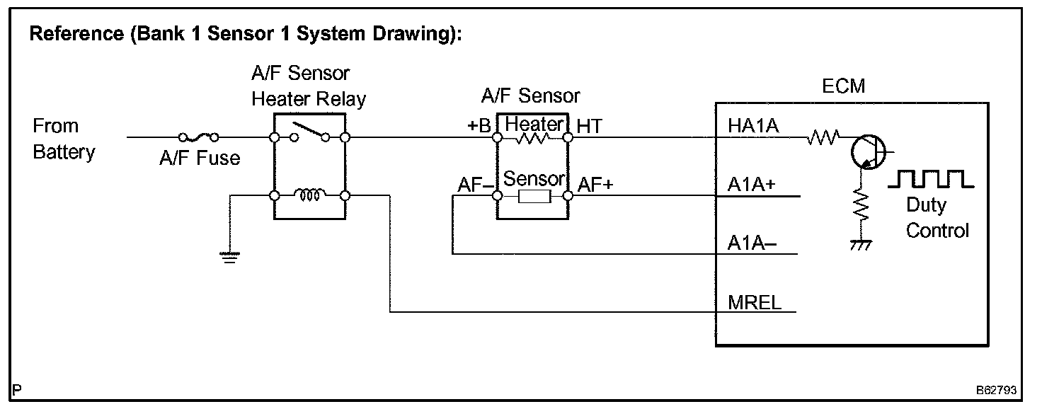 HINT: The ECM provides a pulse width modulated control circuit to adjust current through the heater. The A/F sensor heater circuit uses a relay on the B+ side of the circuit.