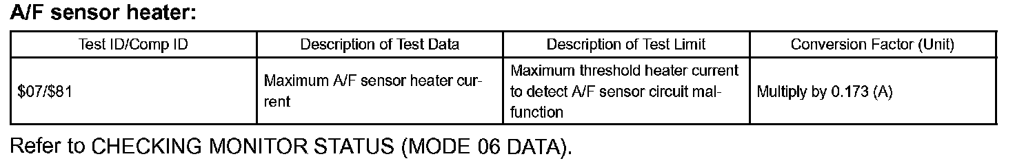 The A/F sensor is equipped with a heater which heats the zirconia element. The heater is also controlled by the ECM. When the intake air volume is low (the temperature of the exhaust gas is low), current flows to the heater to heat the sensor to facilitate detection of accurate oxygen concentration.