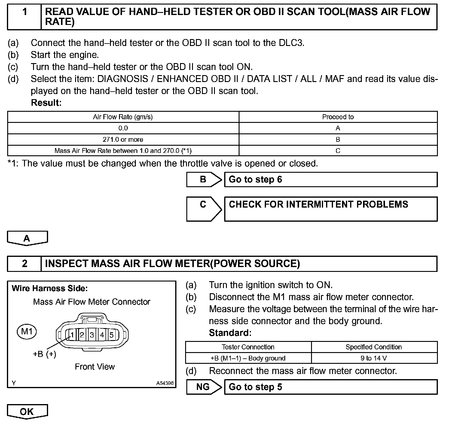 HINT: After confirming DTC P0100, P0102 or P0103, use the hand-held tester or the OBD II scan tool to confirm the air flow ratio in the DIAGNOSIS / ENHANCED OBD II / DATA LIST / ALL.