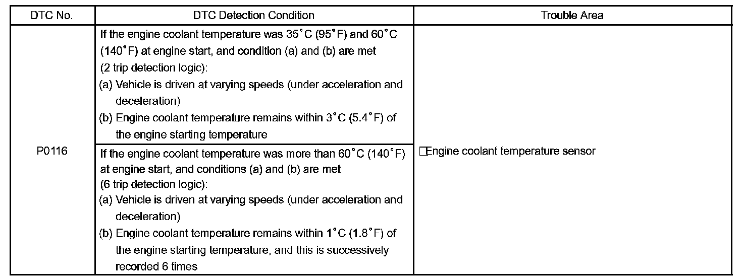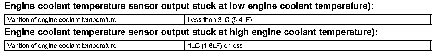 1. Upon starting the engine, the coolant temperature (ECT) was between 35 °C (95 °F) and 60 °C (140 °F). If after driving for 250 seconds, the ECT still remains within 3 °C (5.4 °F) of the staring temperature, a DTC will be set (2 trip detection logic).