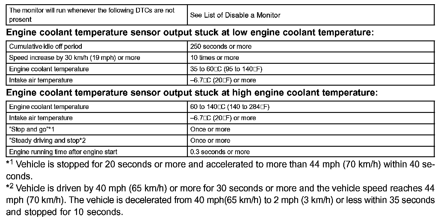 2. Upon starting the engine, the coolant temperature (ECT) was over 60 °C (140 °F). If, after driving for 250 seconds, the ECT still remains within 1 °C (1.8 °F) of the starting temperature, a DTC will be set (6 trip detection logic).