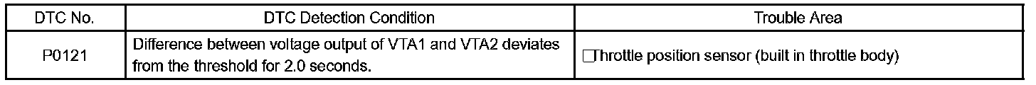 This sensor includes two signals: VTA1 and VTA2. VTA1 is used to detect the throttle opening angle and VTA2 is used to detect malfunction in VTA1. There are several checks that the ECM performs to confirm proper operation of the throttle position sensor and VTA1.