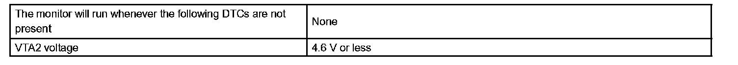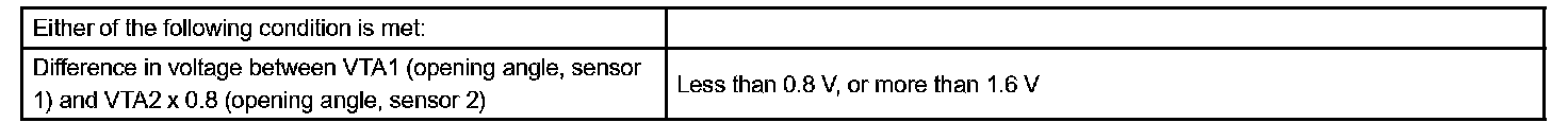 The output voltage difference between VTA1 and VTA2 multiplied by 0.8 (corrected by learning value) should be more than 0.8 V and less than 1.6 V. If the voltage output difference deviates from this range, the ECM concludes the throttle position sensor has a malfunction. The ECM will turn on the MIL and a DTC is set.