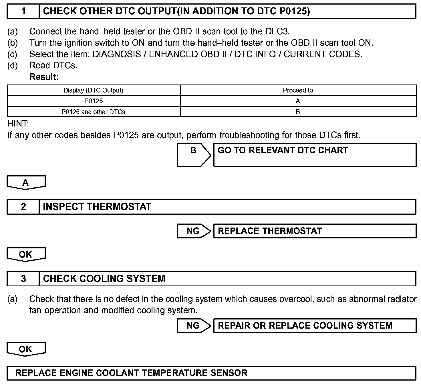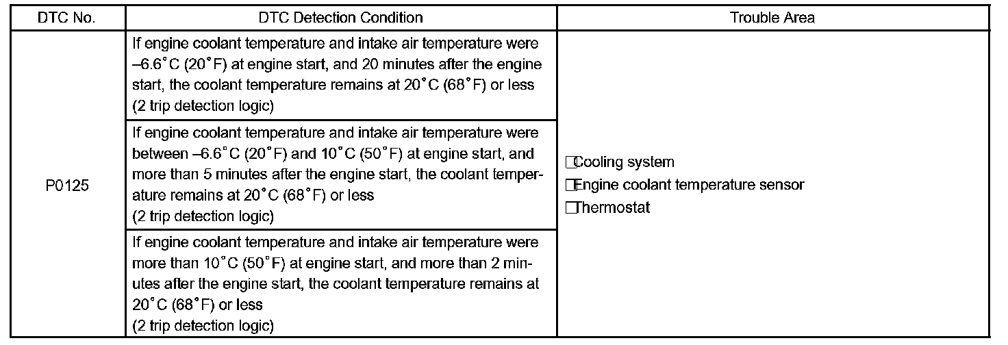 - If DTCs P0115, P0116, P0117, P0118 and P0125 are output simultaneously, engine coolant temperature sensor circuit may be open or short. Perform troubleshooting on DTC P0115, P0117 or P0118 first.