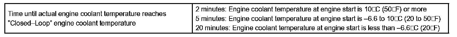 The engine coolant temperature was 0 °C (32 °F) at engine start. After 5 minutes running time, the engine coolant temperature sensor still indicates that the engine is not warm enough to begin active feedback control of the air-fuel ratio. The ECM interprets this as a fault in the sensor or cooling system and will set a DTC.