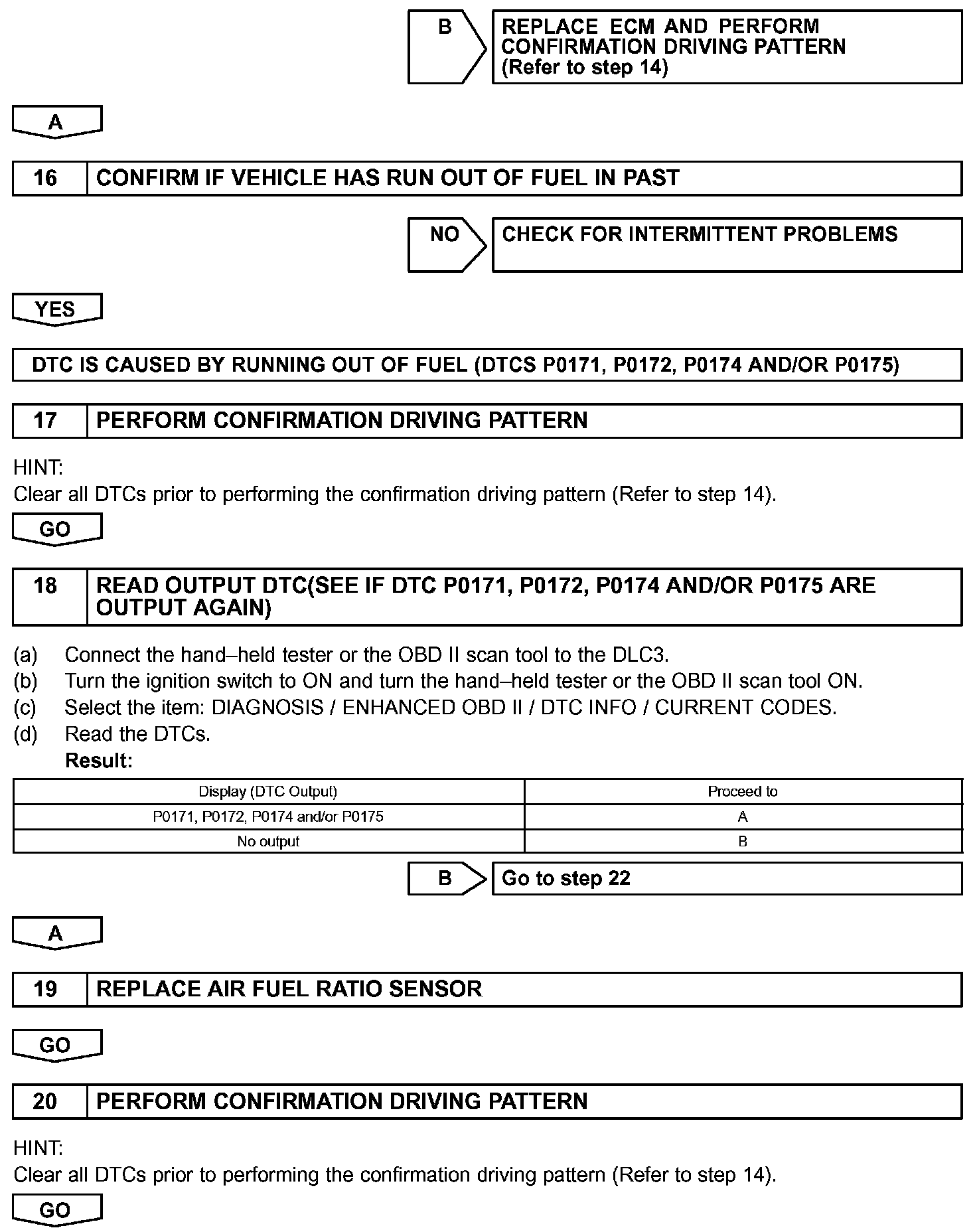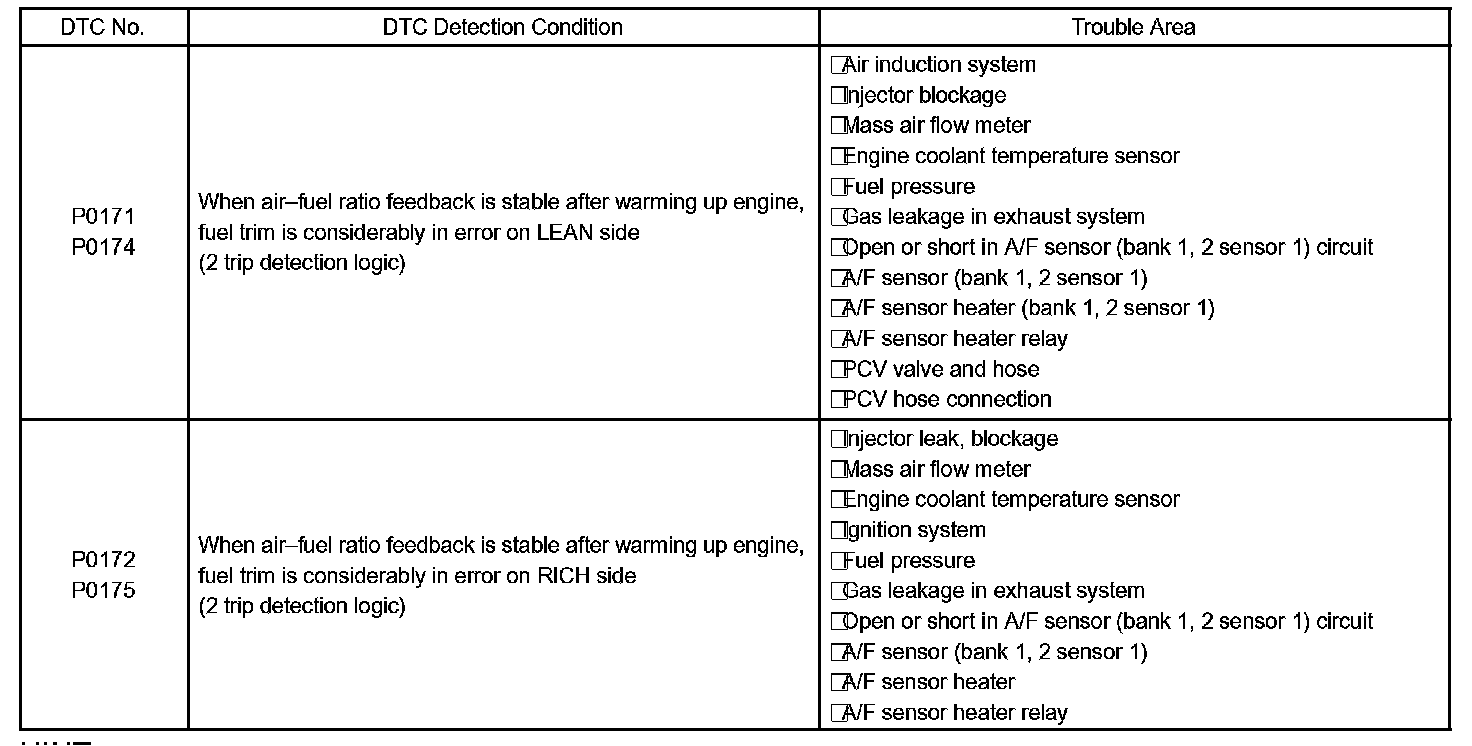 - When DTC P0171 or P0174 is recorded, the actual air-fuel ratio is on the LEAN side. When DTC P0172 or P0175 is recorded, the actual air-fuel ratio is on the RICH side.