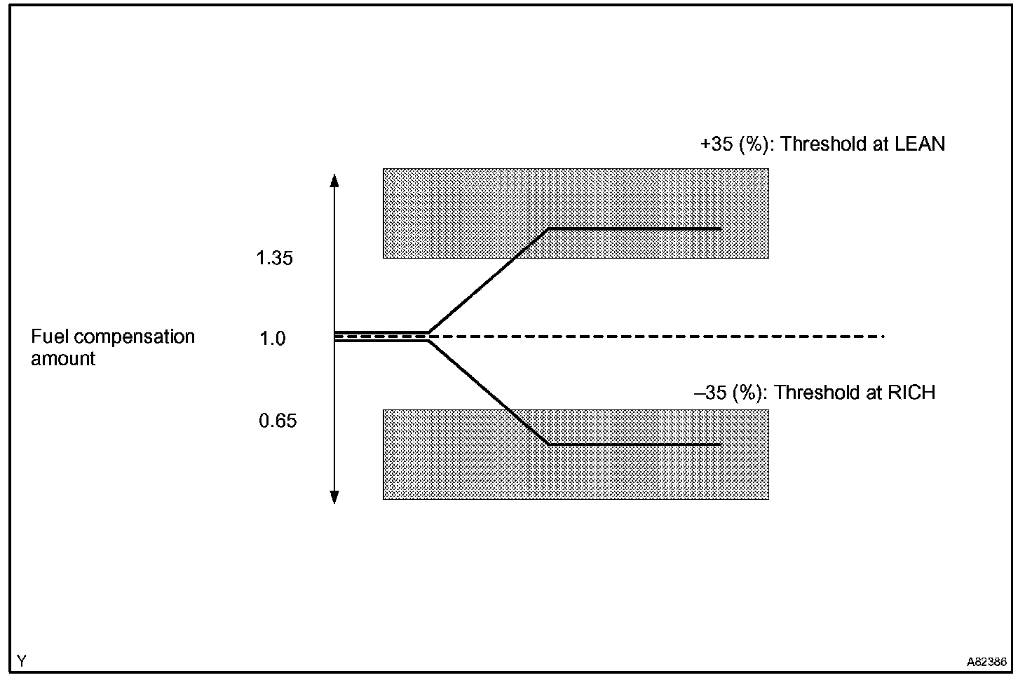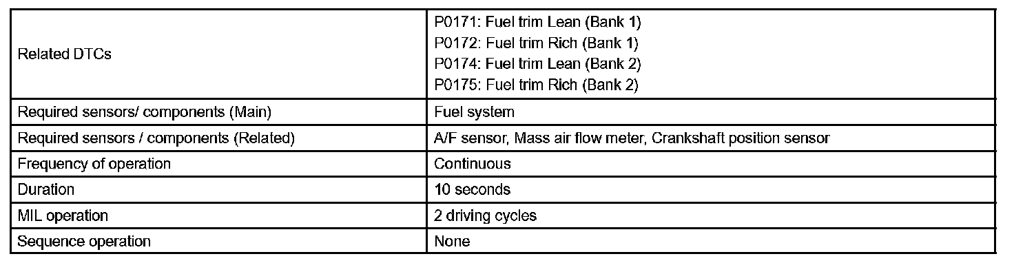 If both the short-term fuel trim and the long-term fuel trim are LEAN or RICH beyond a certain value, it is detected as a malfunction and the MIL is illuminated and a DTC is set.