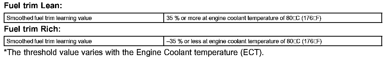 The smoothed fuel trim leaning value is more than +35% or less than -35%. The ECM interprets this as a failure in the fuel system.