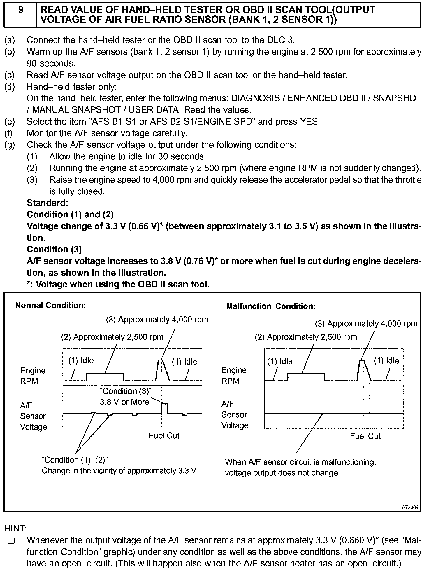 The following A/F CONTROL procedure enables the technician to check and graph the voltage outputs of both the A/F sensor and the heated oxygen sensor.