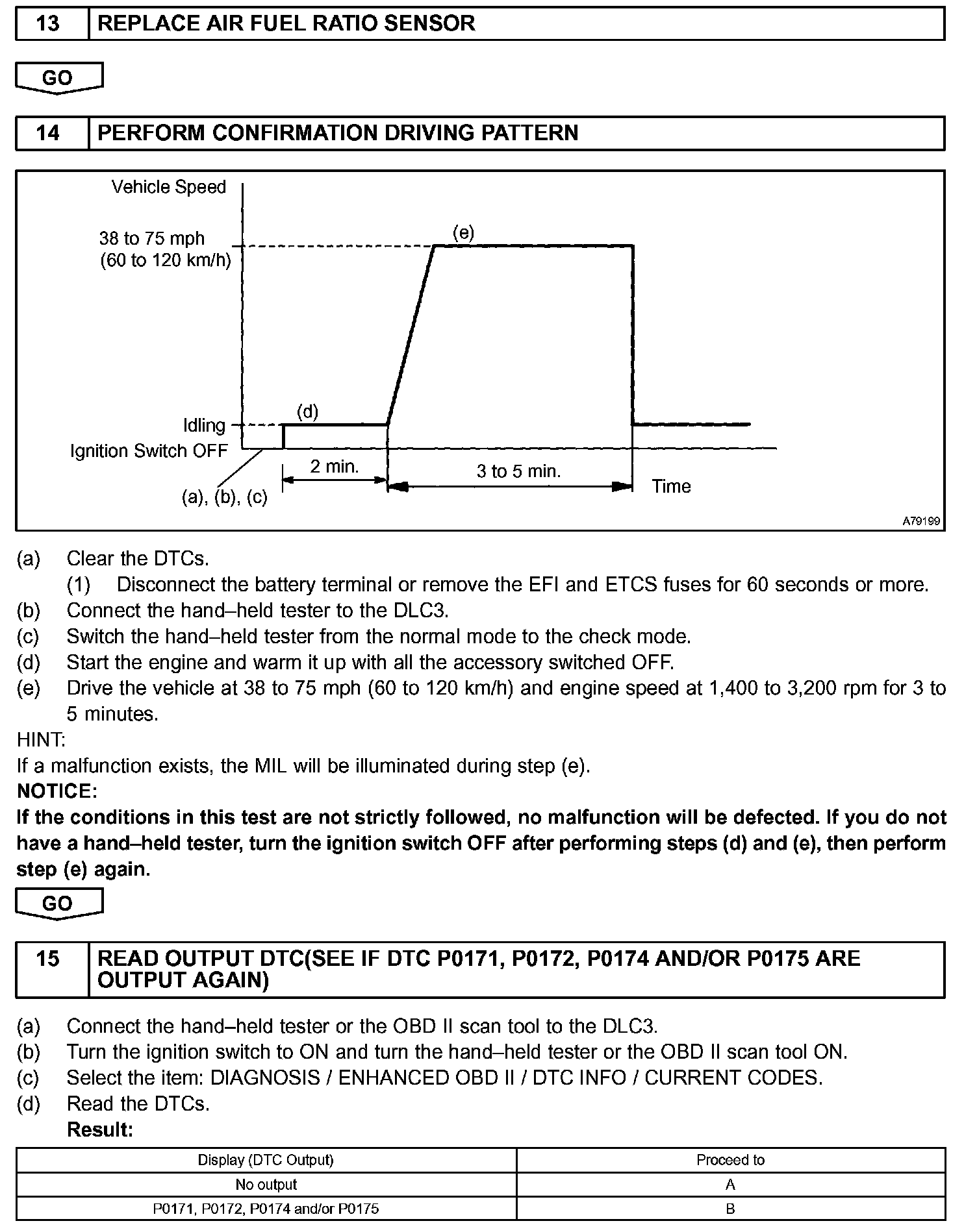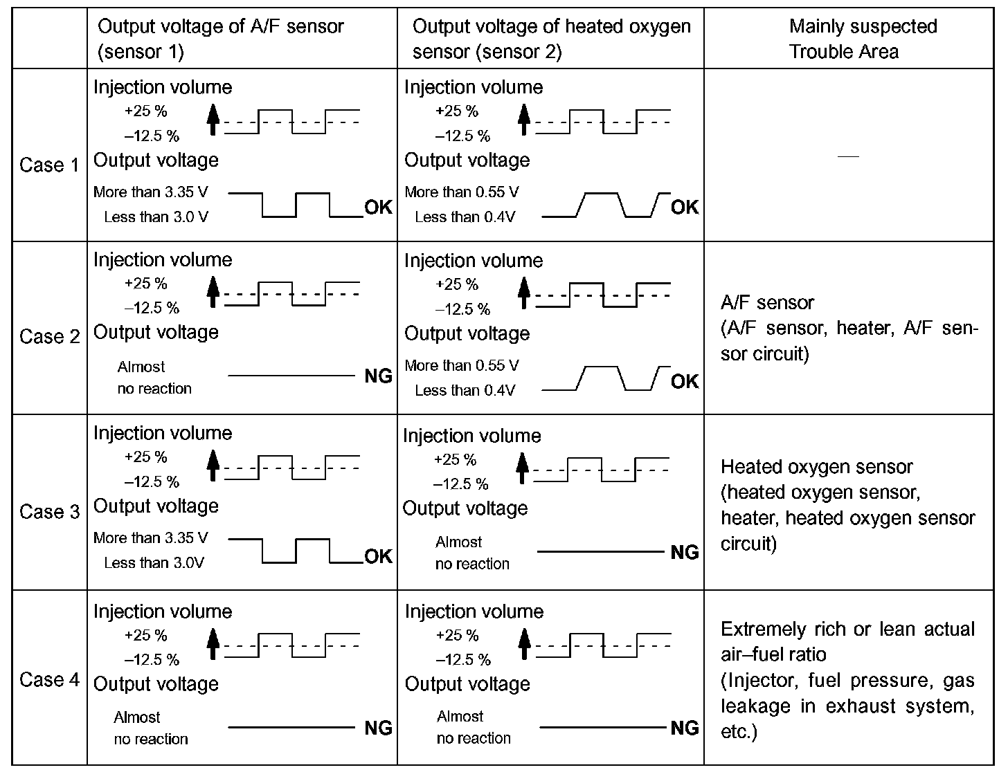 It is possible the malfunctioning area can be found using the ACTIVE TEST A/F CONTROL operation. The A/F CONTROL operation can determine if the A/F sensor, heated oxygen sensor or other potential trouble areas are malfunctioning or not.