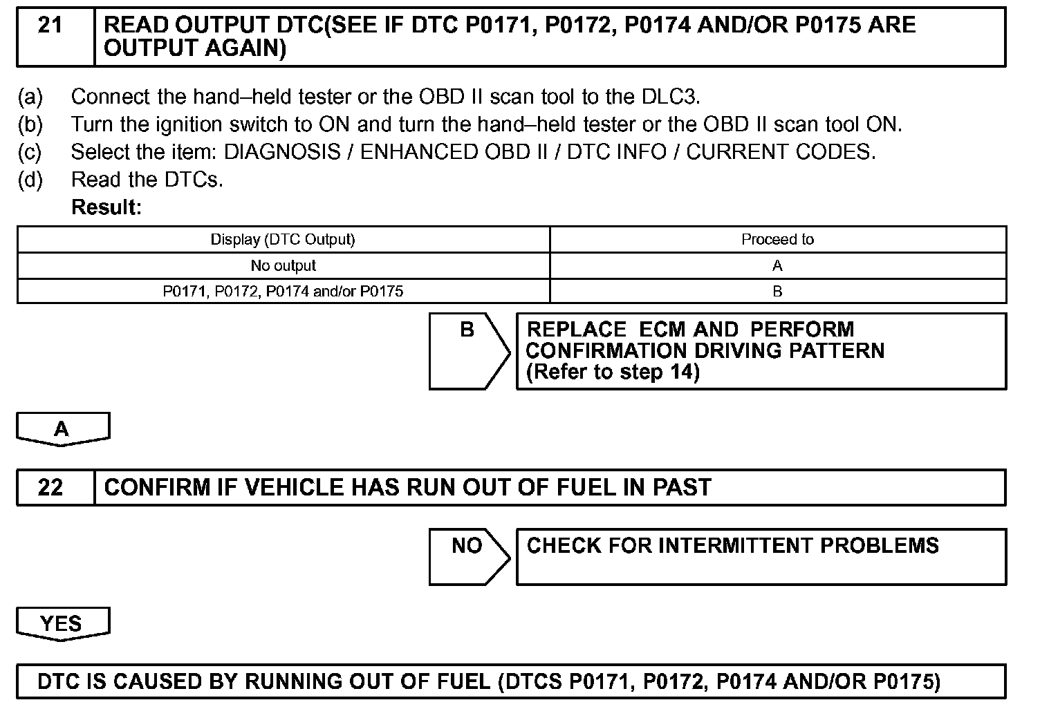 - If the vehicle runs out of fuel, the air-fuel ratio is LEAN and DTC P0171 or P0174 may be recorded. The MIL then illuminates.