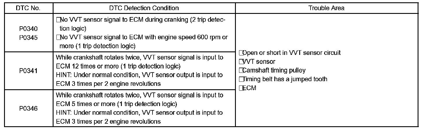 - DTC P0341 and P0346 indicate a malfunction related to the VVT sensor (-) circuit.
