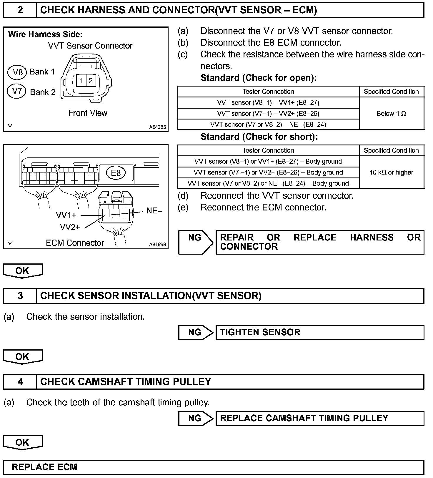 If there is no signal from the VVT sensor even though the engine is turning, or if the rotation of the camshaft and crankshaft is not synchronized, the ECM interprets this as a malfunction of the sensor.