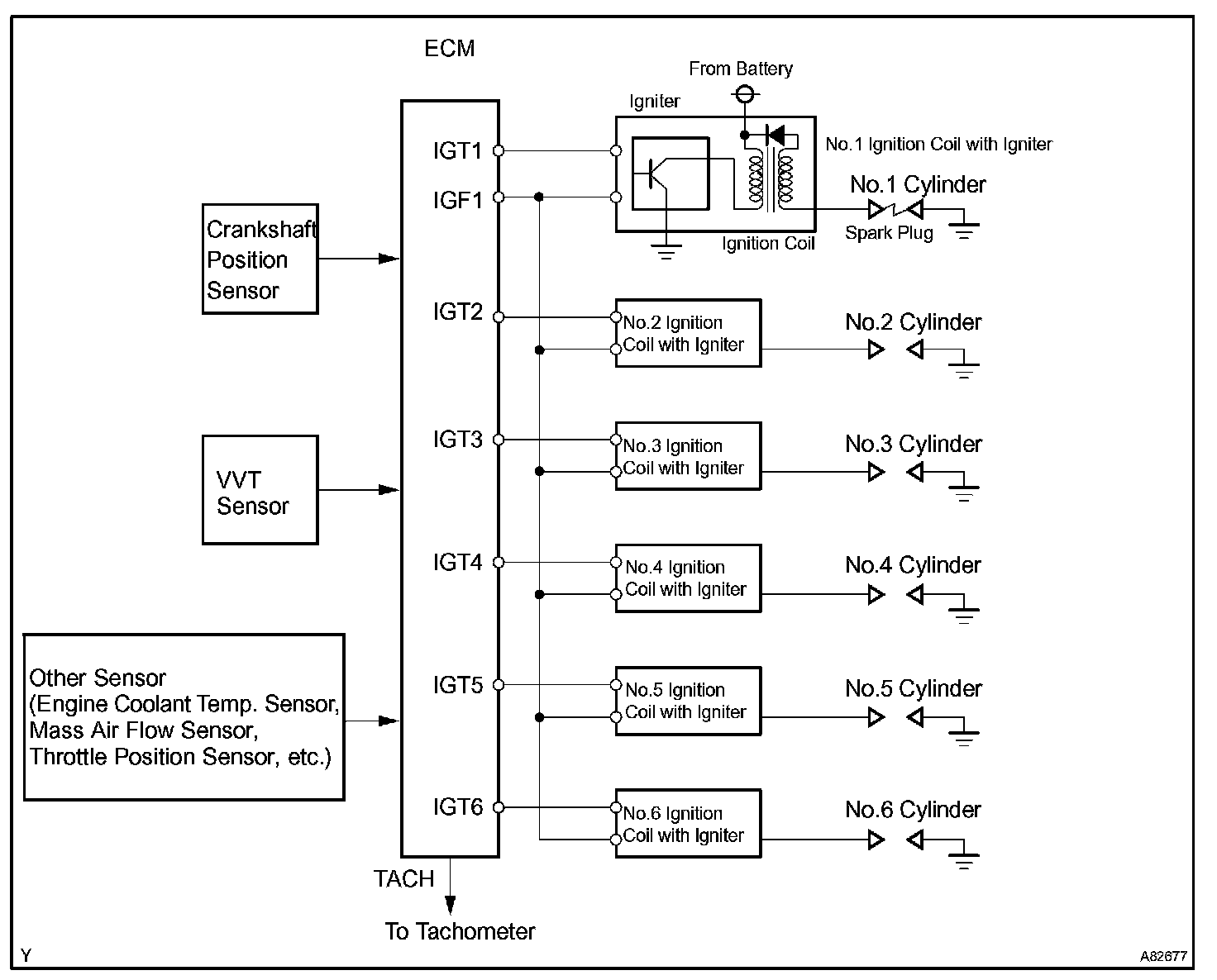 The ECM determines the ignition timing and outputs the ignition signals (IGT) for each cylinder. Using the ignition (IGT) signal, the ECM turns on and off the power transistor inside the igniter and this switches on and off the current to the primary coil. When the current flow to the primary coil is cut off, high-voltage is generated in the secondary coil and this voltage is applied to the spark plugs to spark inside the cylinders.
