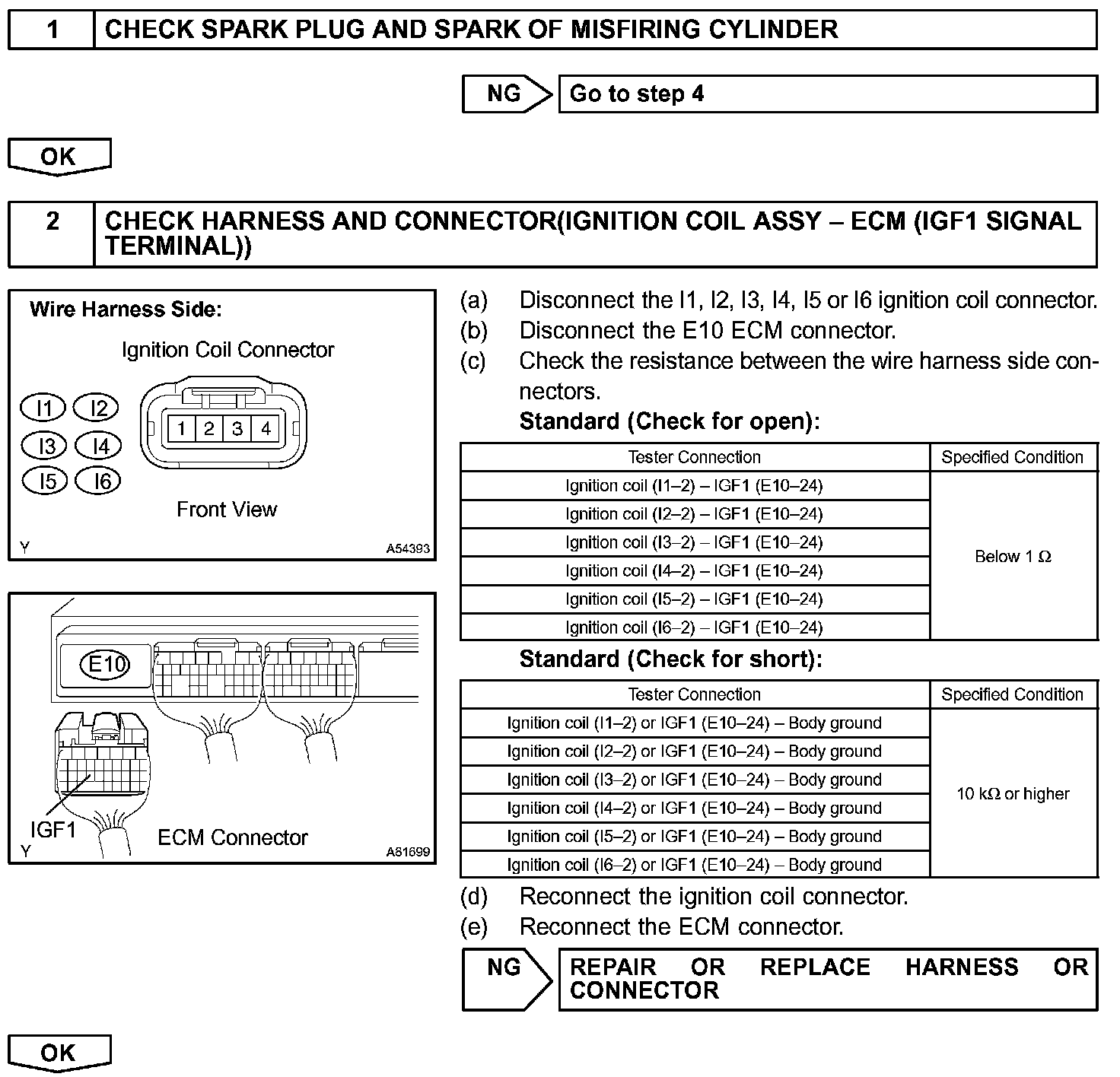 If the ECM does not receive the ignition confirmation signal (IGF) after sending the ignition signal (IGT), it interprets this as a fault in the igniter and sets a DTC.