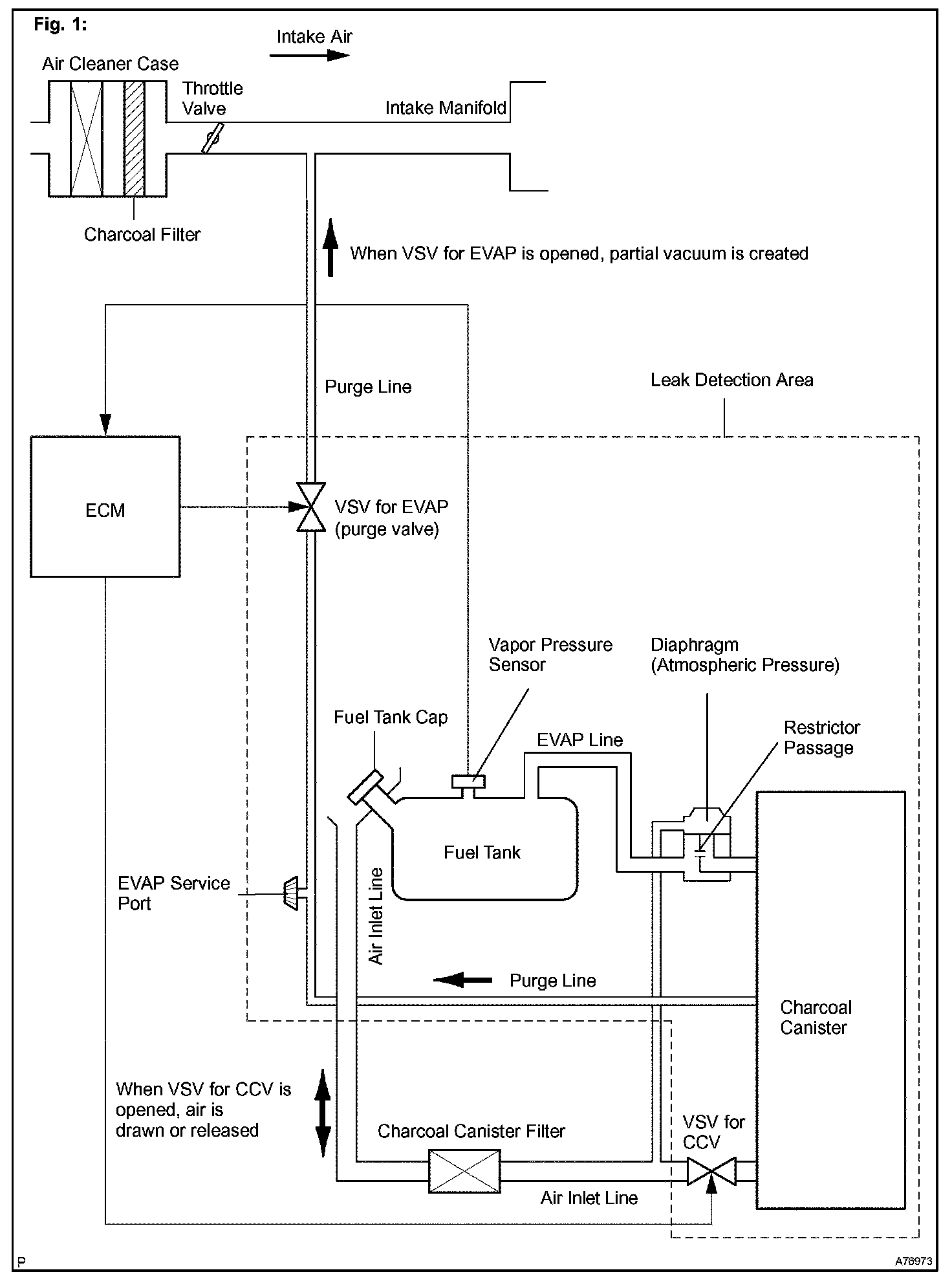 The ECM monitors the vapor pressure sensor in two ways. One method examines the fluctuation of the electrical signal while the engine is idling. If the pressure signal varies beyond the specified range more than 7 times, the ECM interprets this as a fault in the vapor pressure sensor. The ECM also verifies that the pressure signal changes within the specified range. If the output of the sensor does not vary for 5 minutes while the intake air amount has been changing, the ECM interprets this as a fault in the vapor pressure sensor. Either fault will set DTC P0451 and the ECM will turn on the MIL.