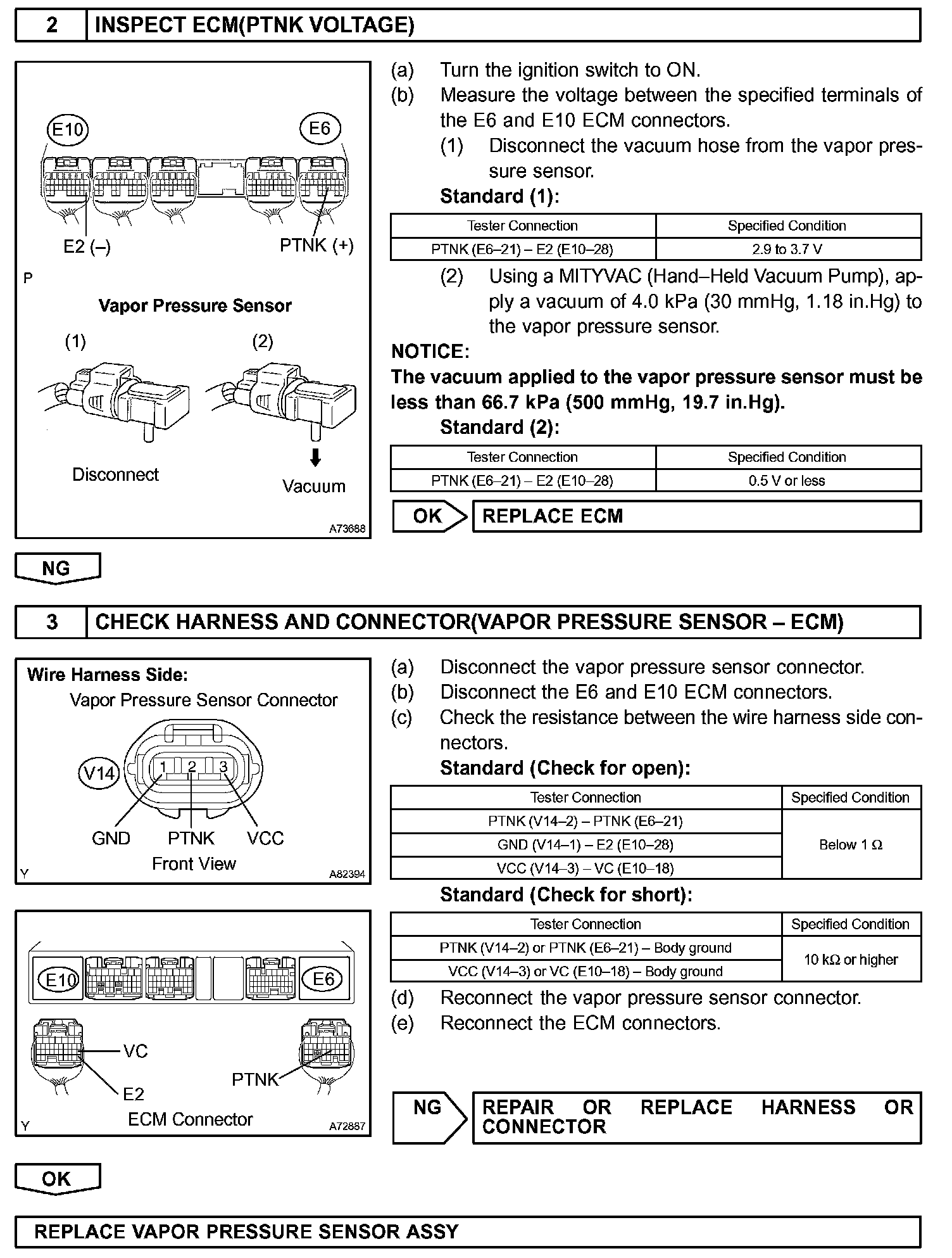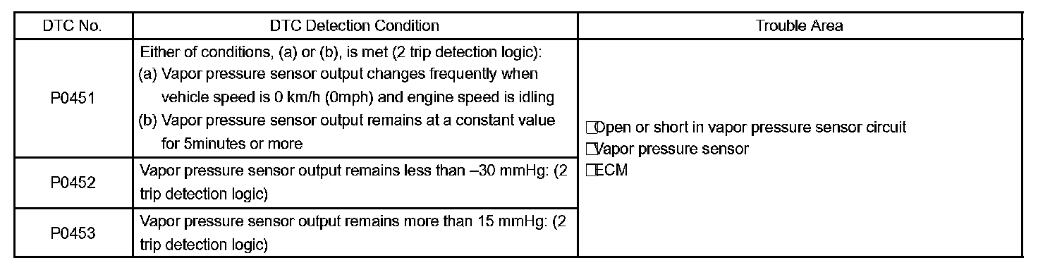 DTC P0451, P0452 or P0453 is recorded by the ECM when the vapor pressure sensor malfunctions.