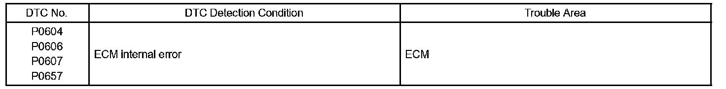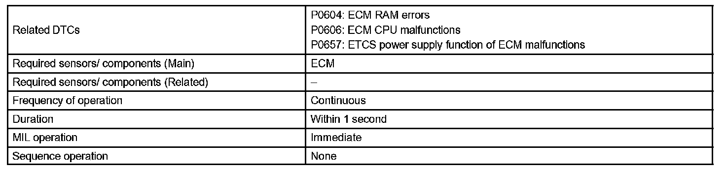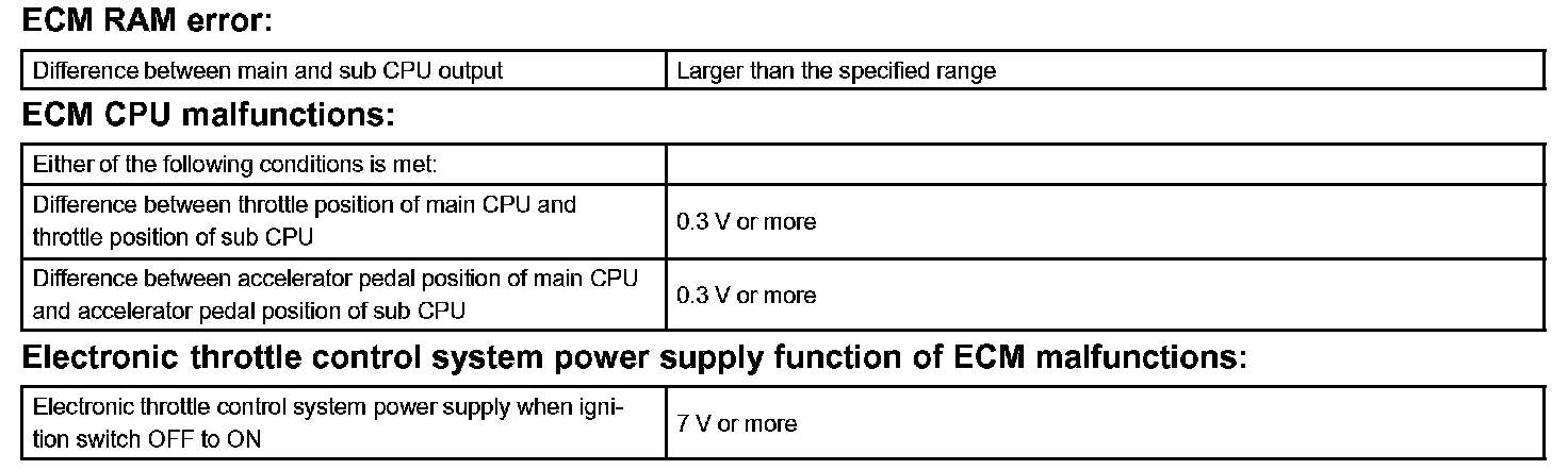 The ECM sets a DTC if: 1) outputs from the 2 CPUs are different and deviate from the standards, 2) the signals to the throttle actuator deviate from the standards, 3) a malfunction is found in the throttle actuator supply voltage, and 4) any other ECM malfunction is found.